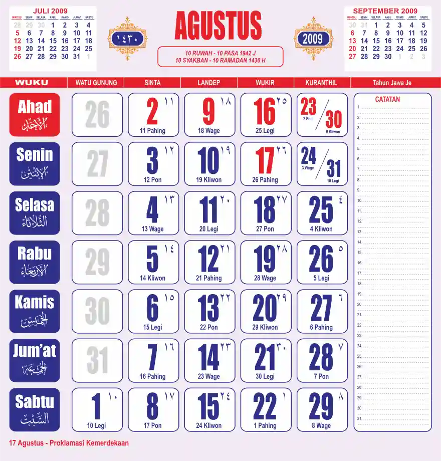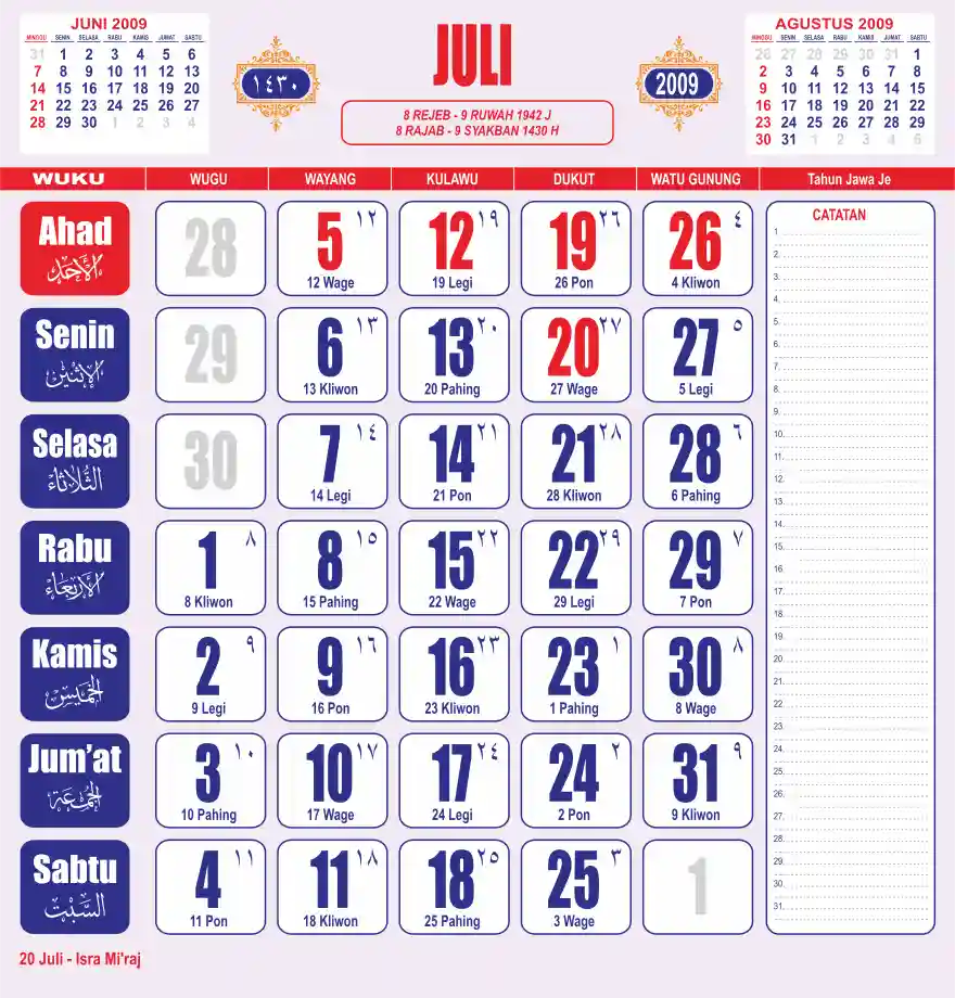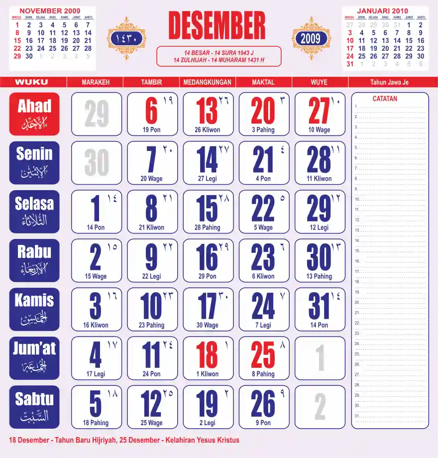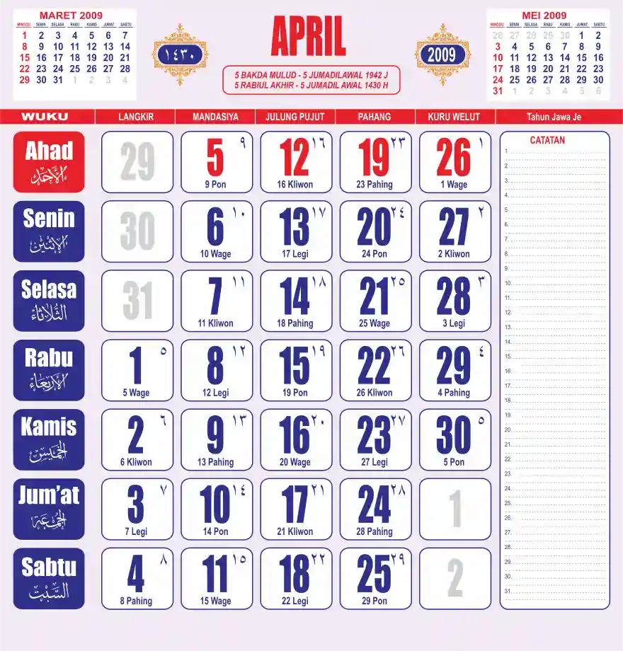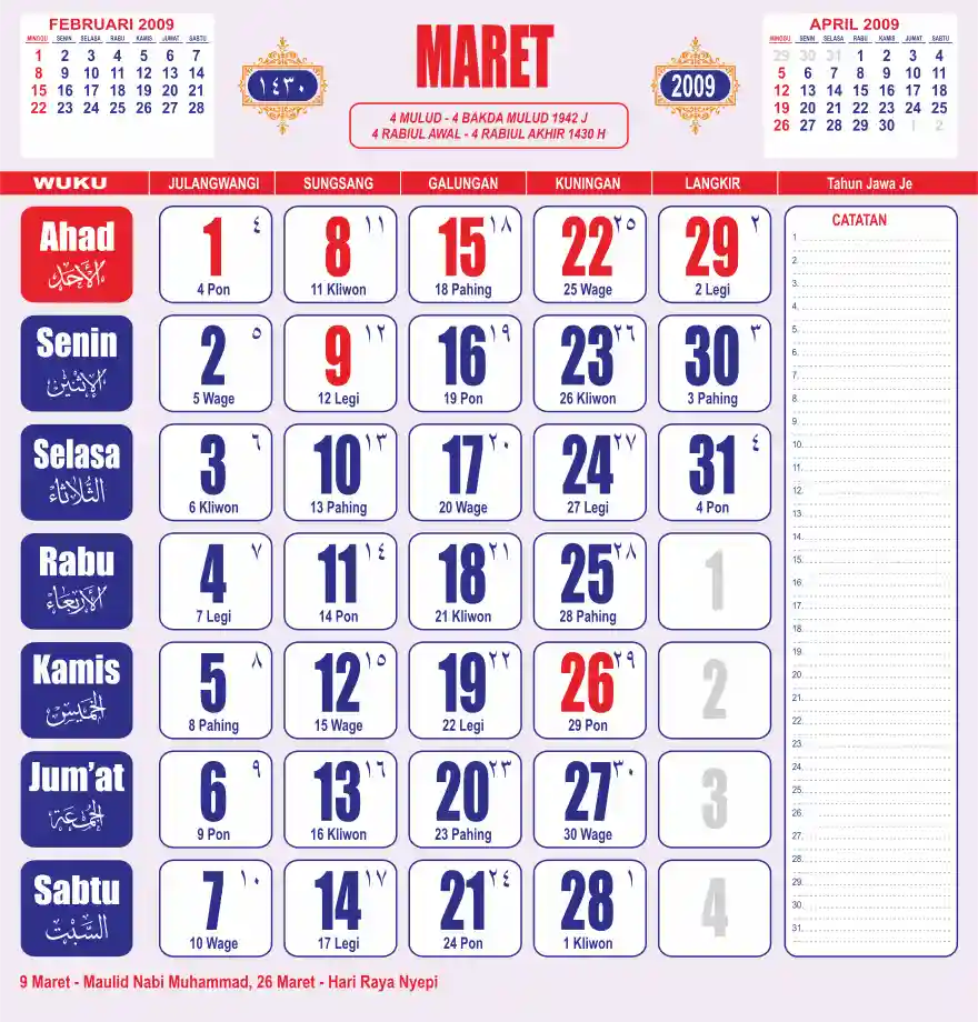 Template kalender 2009 lembaran besar jumbo yang sering dipakai oleh masyarakat jawa lengkap dengan wuku. Kalender ini biasanya di cetak 1 lembar per bulan.