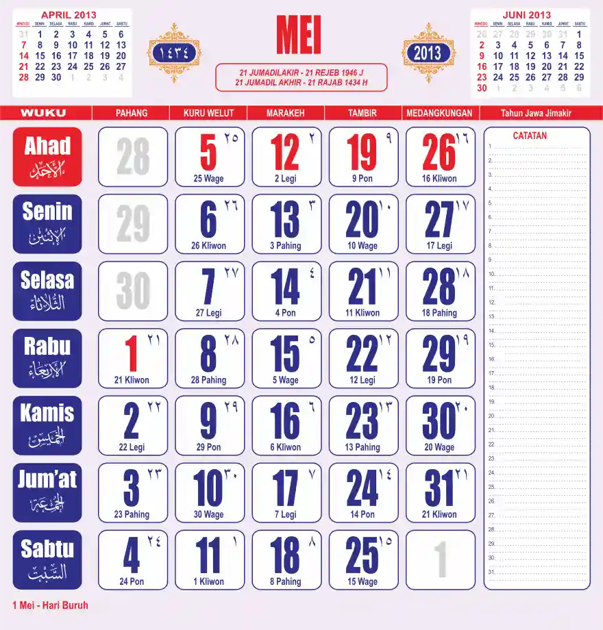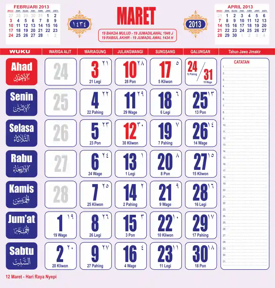 Template kalender 2013 lembaran besar jumbo yang sering dipakai oleh masyarakat jawa lengkap dengan wuku. Kalender ini biasanya di cetak 1 lembar per bulan.