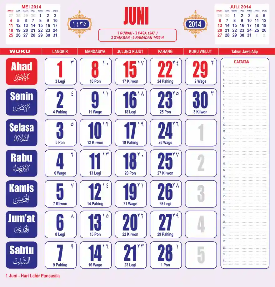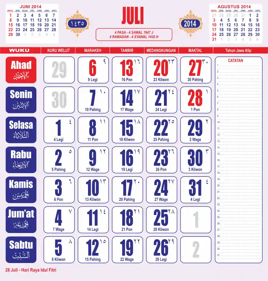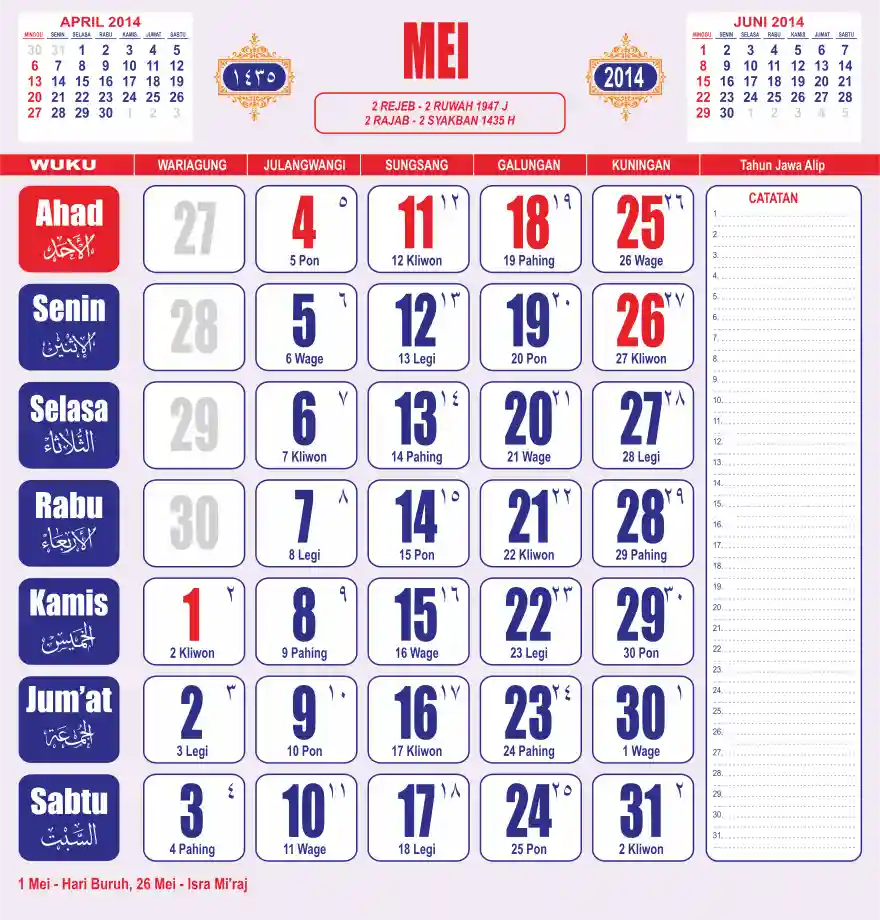 Template kalender 2014 lembaran besar jumbo yang sering dipakai oleh masyarakat jawa lengkap dengan wuku. Kalender ini biasanya di cetak 1 lembar per bulan.