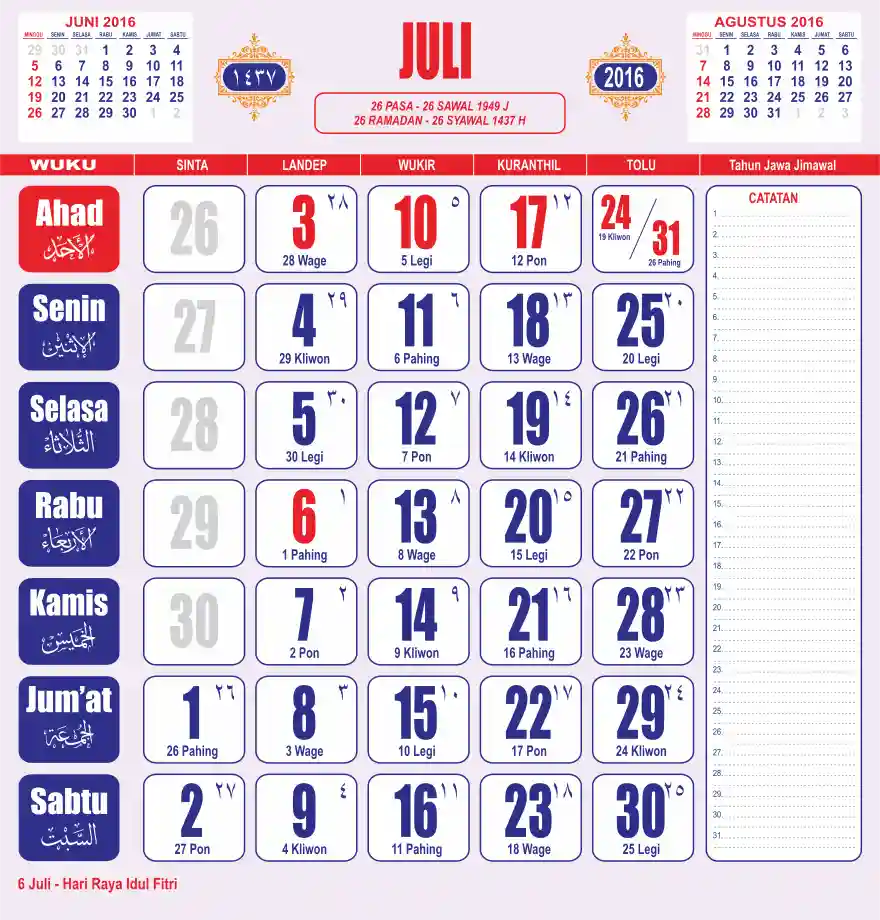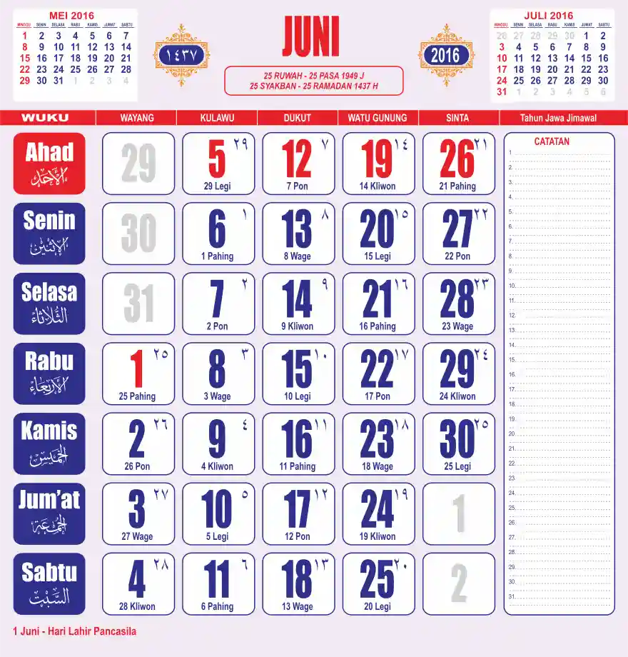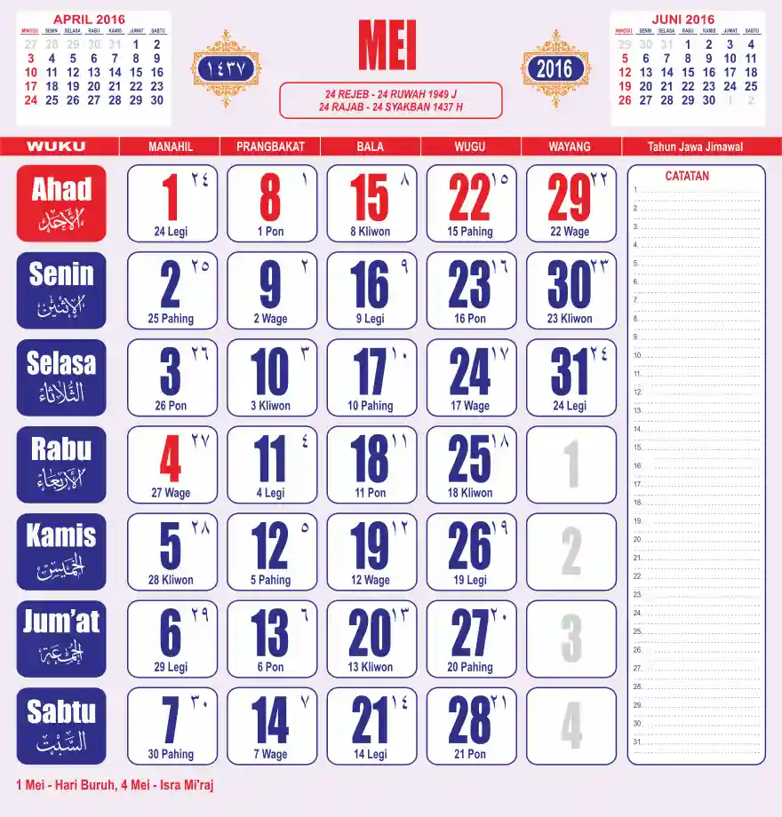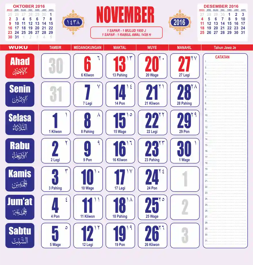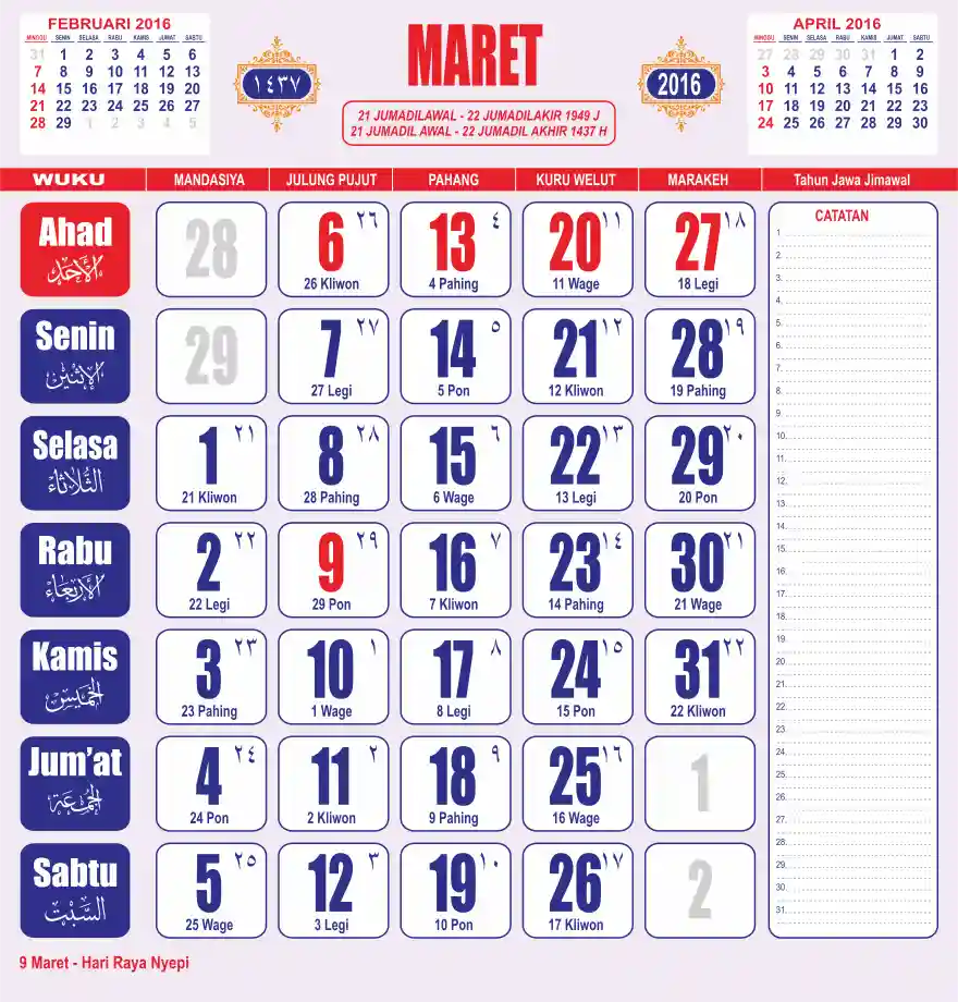 Template kalender 2016 lembaran besar jumbo yang sering dipakai oleh masyarakat jawa lengkap dengan wuku. Kalender ini biasanya di cetak 1 lembar per bulan.