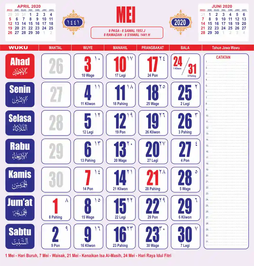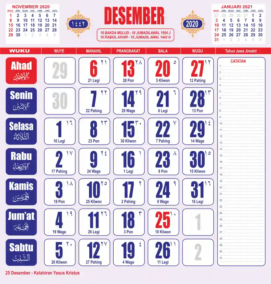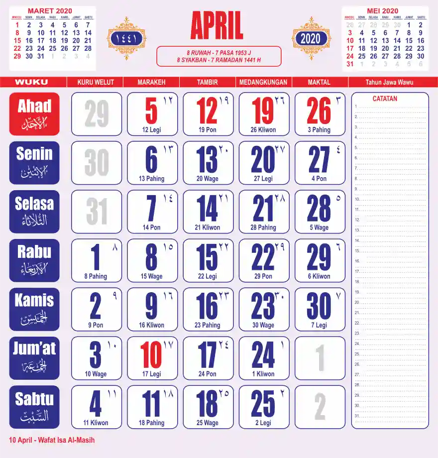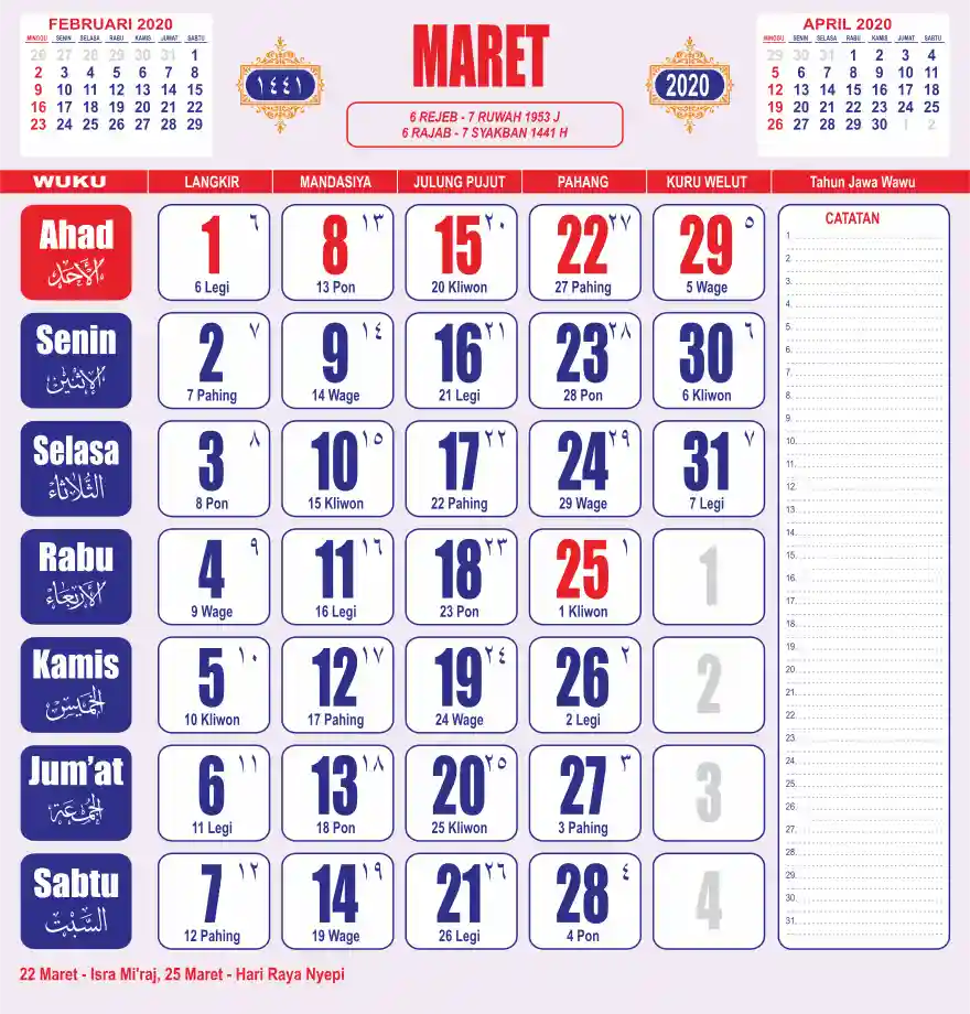 Template kalender 2020 lembaran besar jumbo yang sering dipakai oleh masyarakat jawa lengkap dengan wuku. Kalender ini biasanya di cetak 1 lembar per bulan.