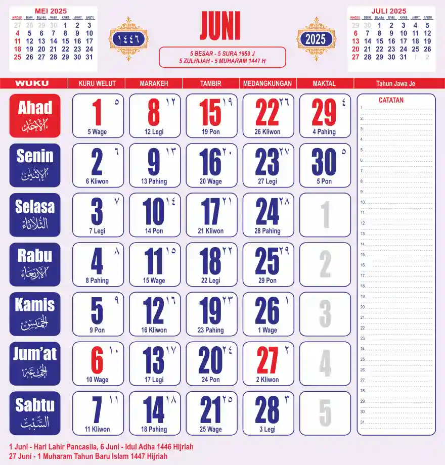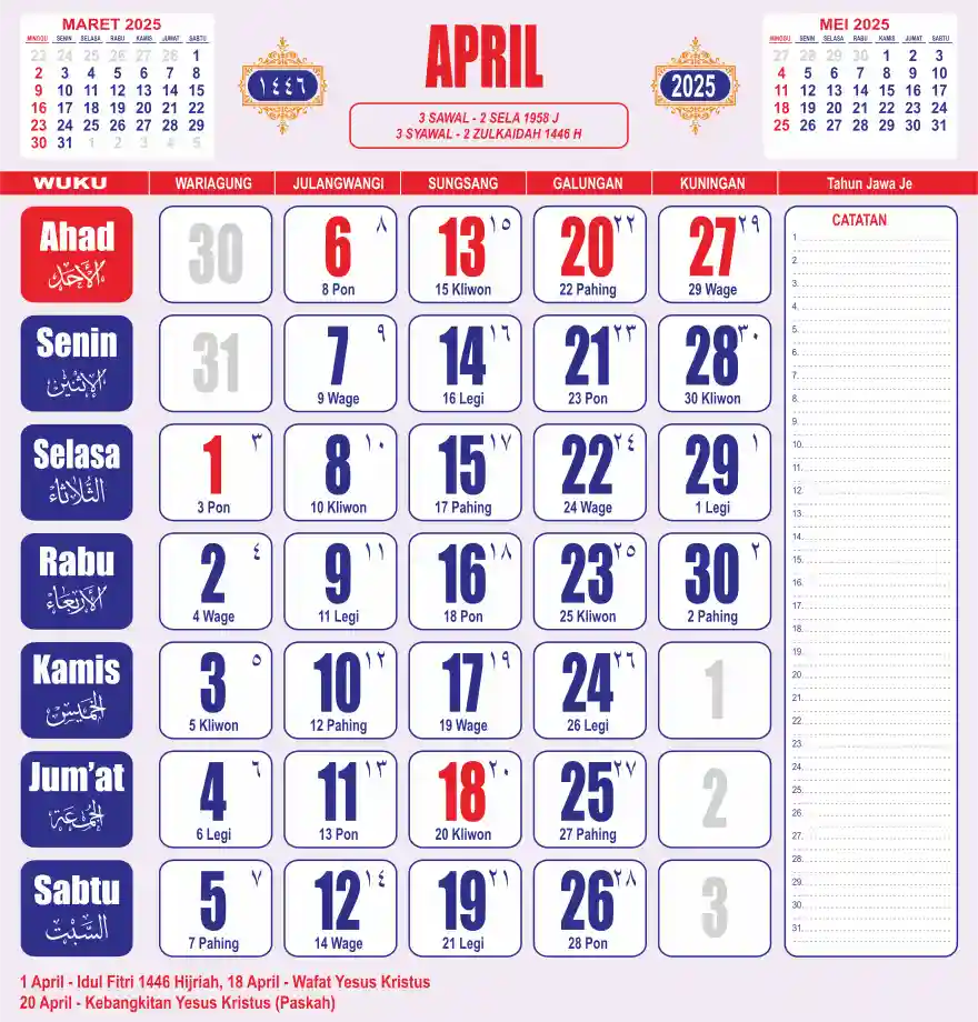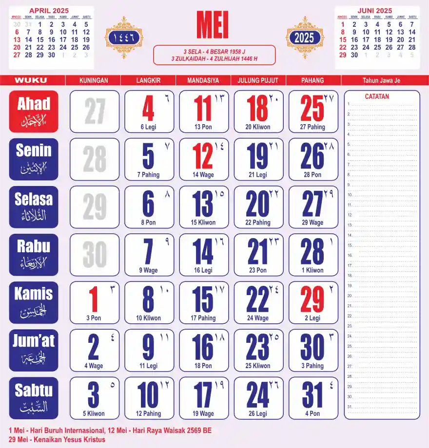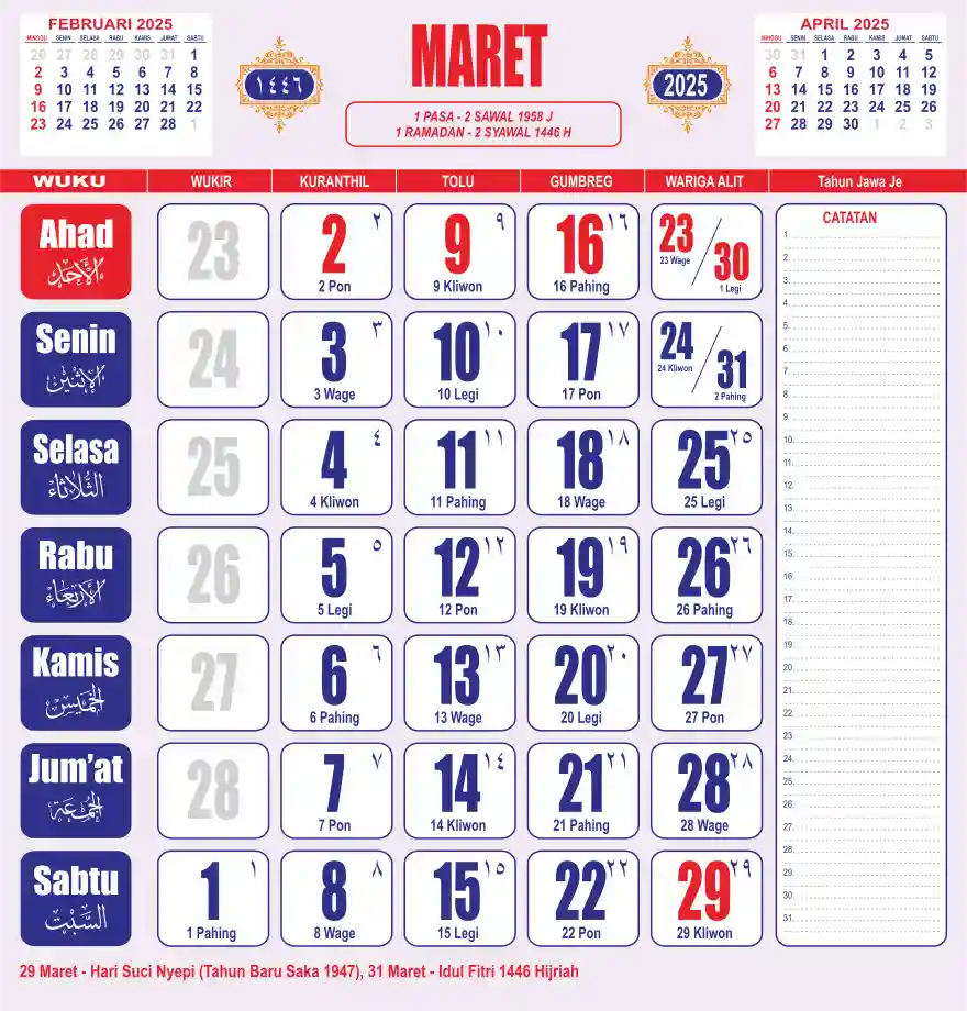 Template kalender 2025 lembaran besar jumbo yang sering dipakai oleh masyarakat jawa lengkap dengan wuku. Kalender ini biasanya di cetak 1 lembar per bulan.