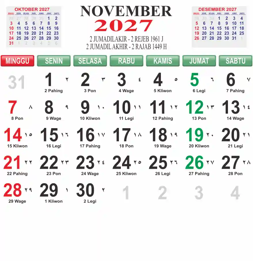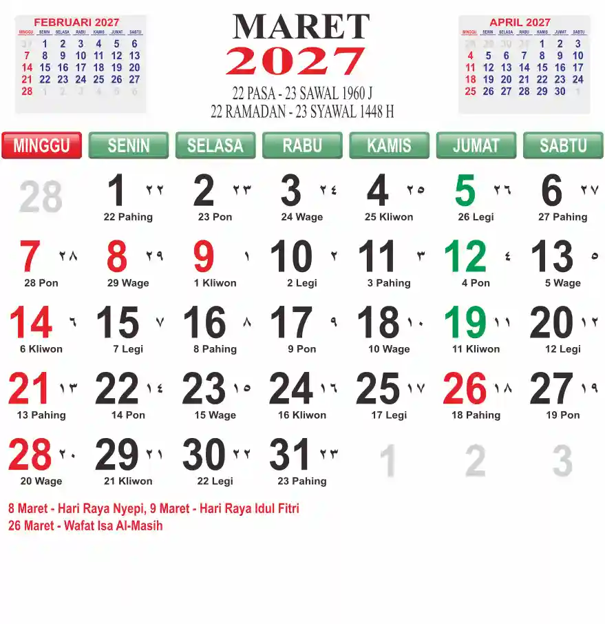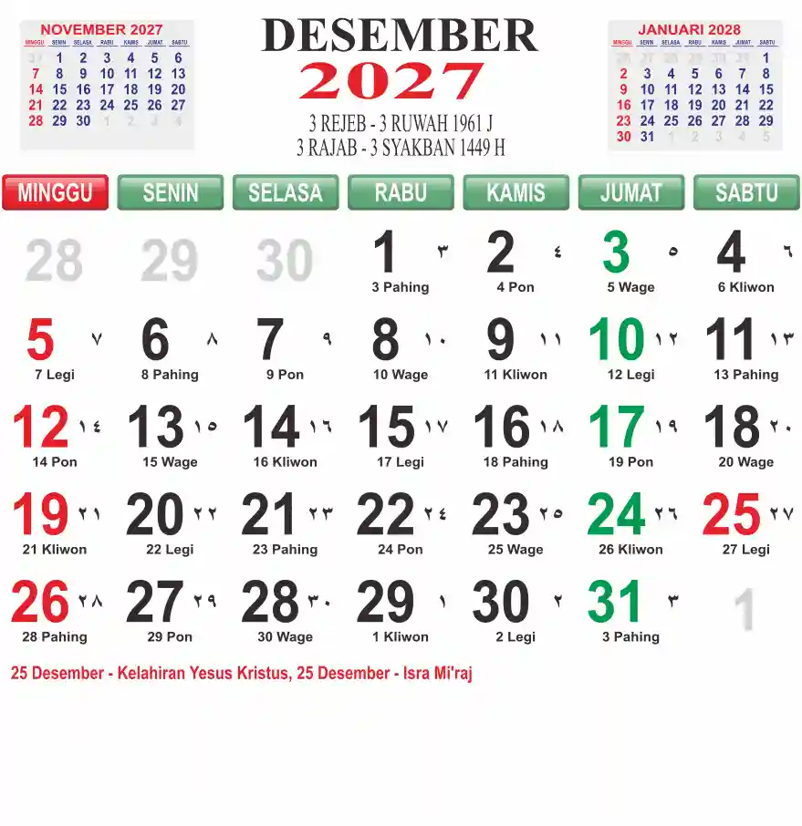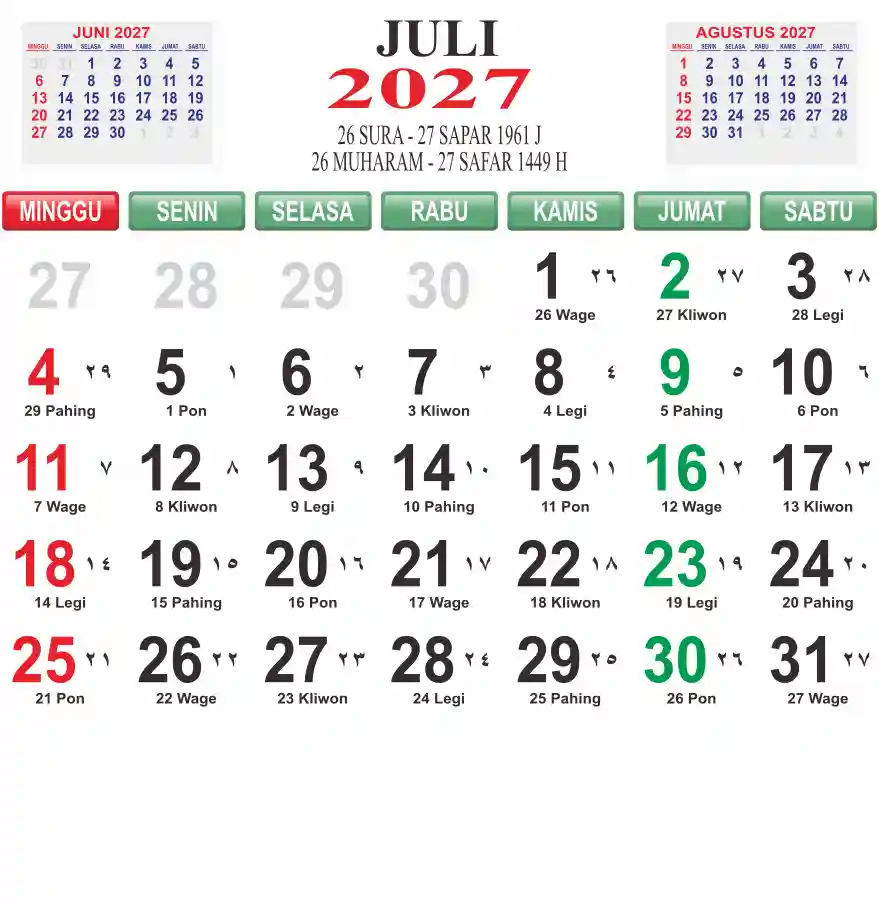 Template kalender 2027 lembaran besar jumbo yang mudah di baca dari jarak jauh. Kalender ini biasanya di cetak 1 lembar per bulan.