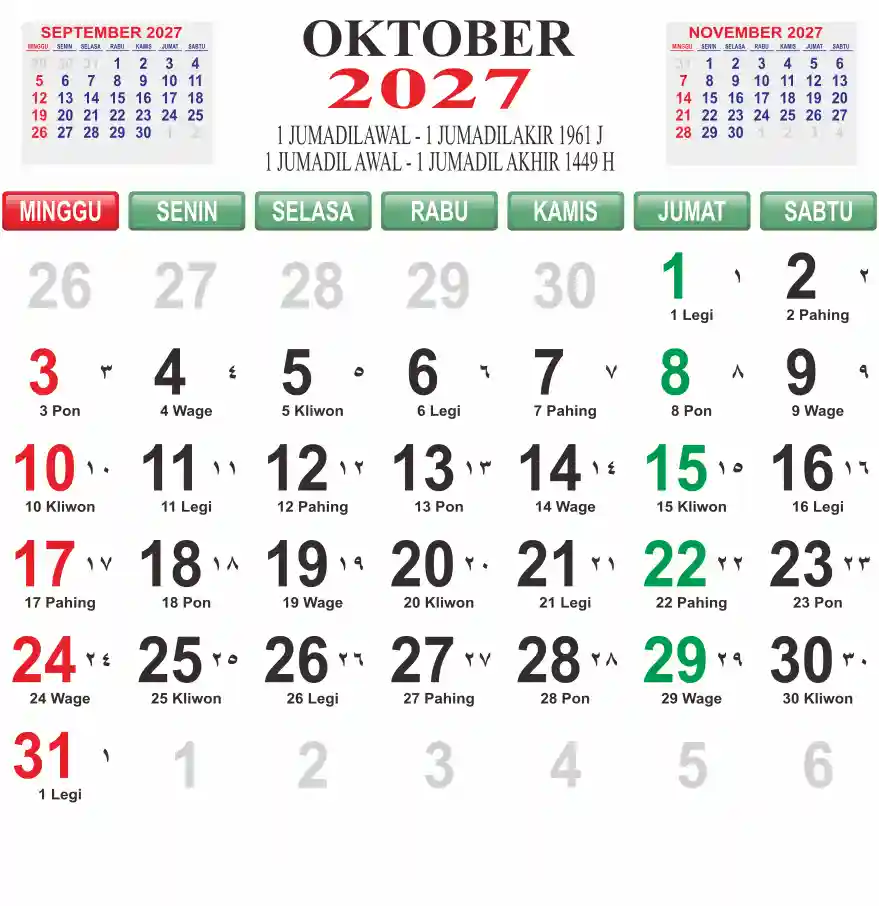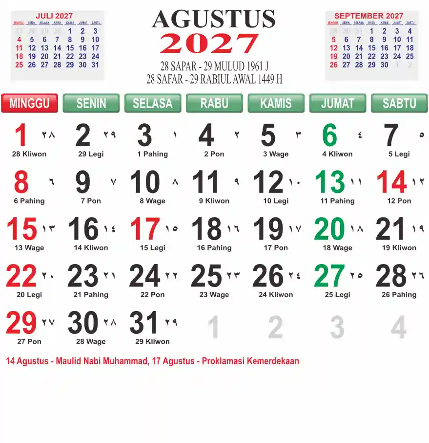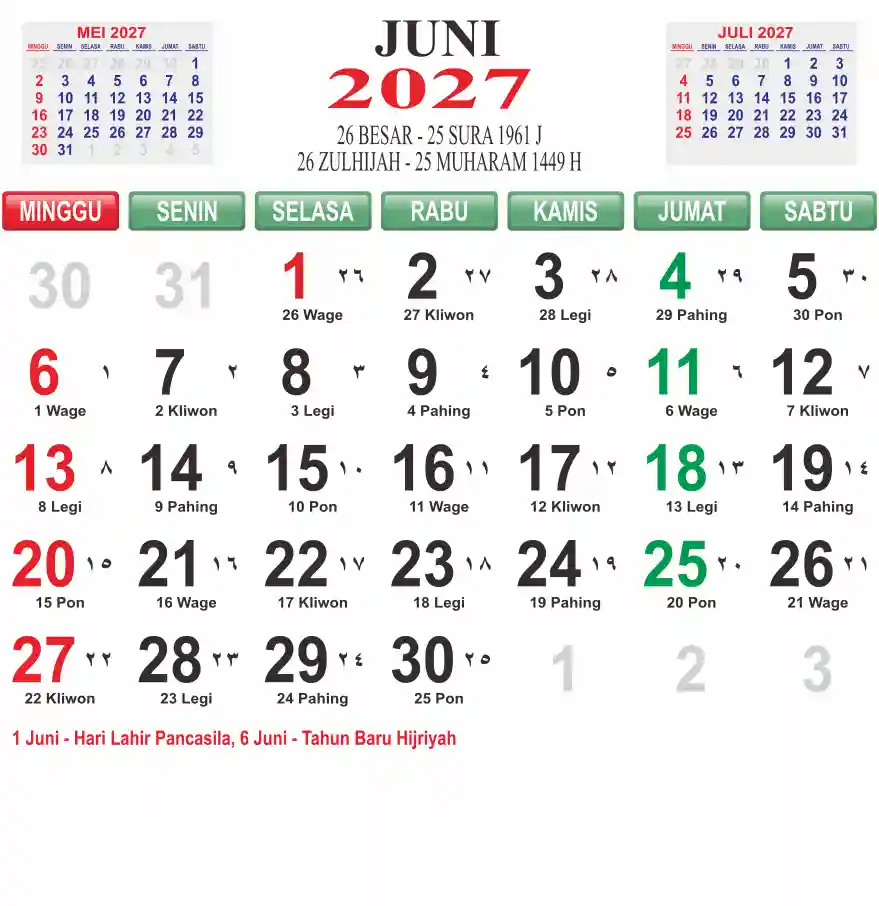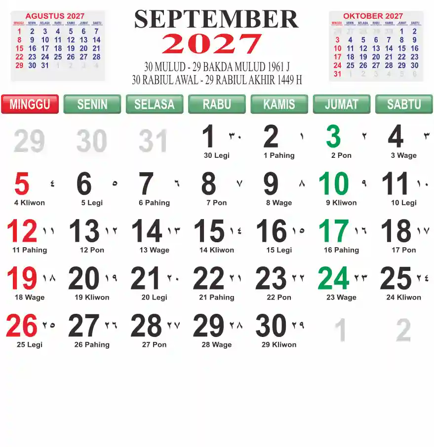 Template kalender 2027 lembaran besar jumbo yang mudah di baca dari jarak jauh. Kalender ini biasanya di cetak 1 lembar per bulan.