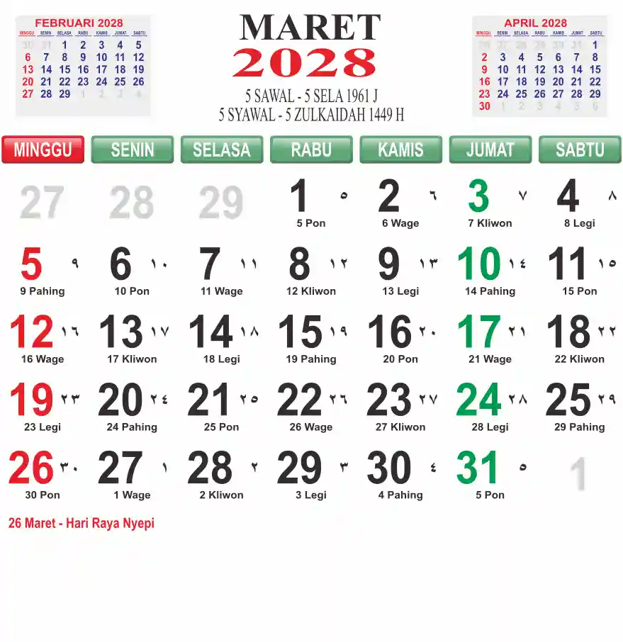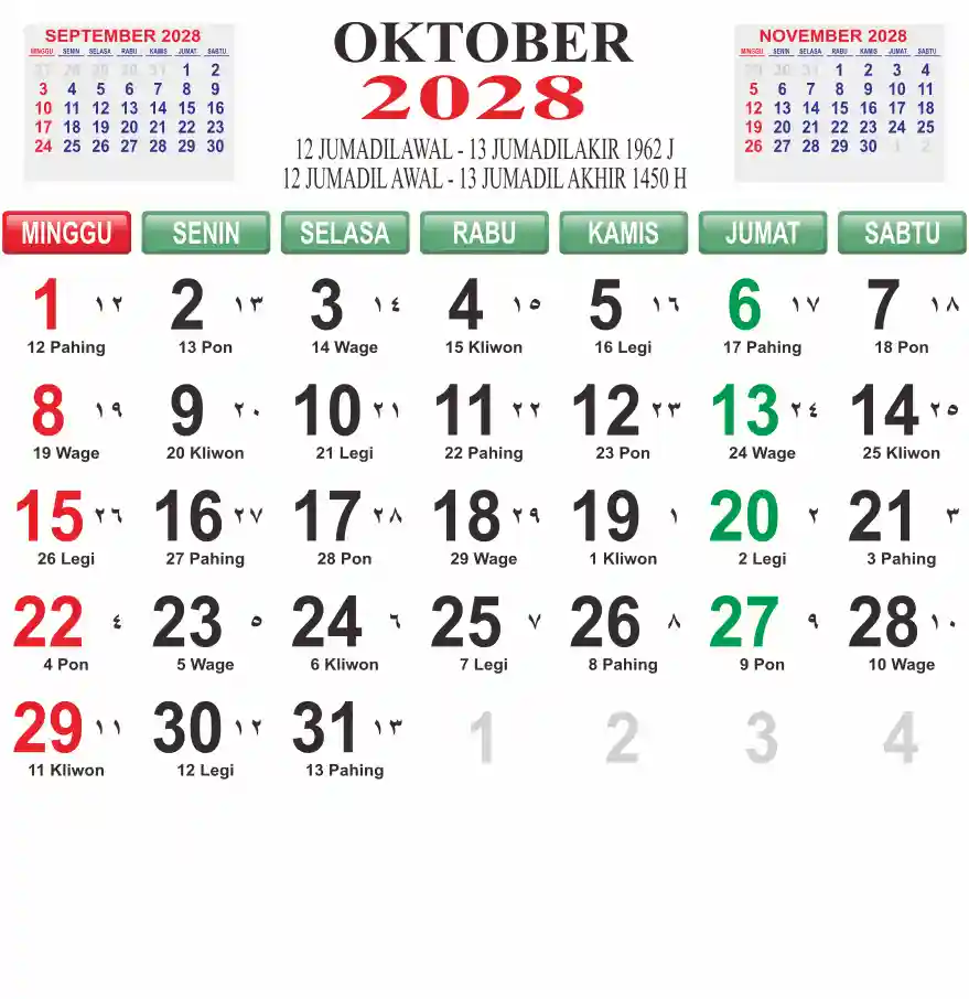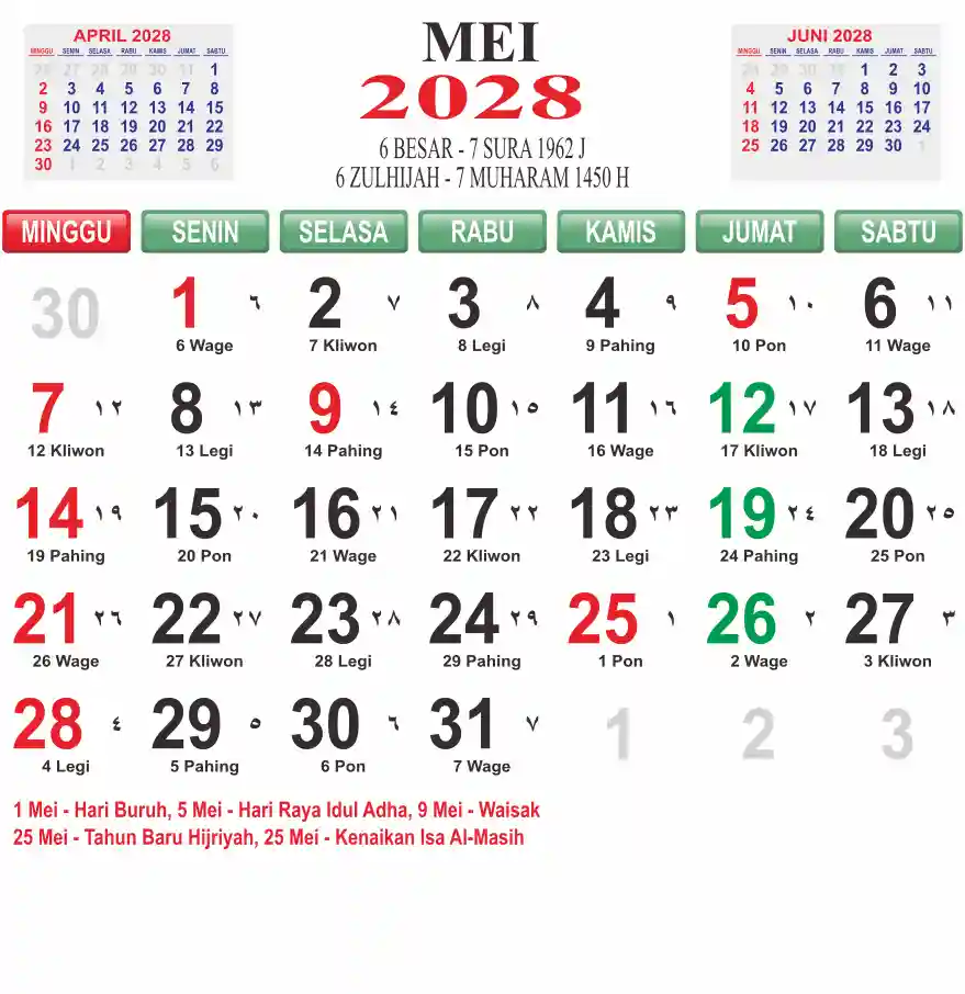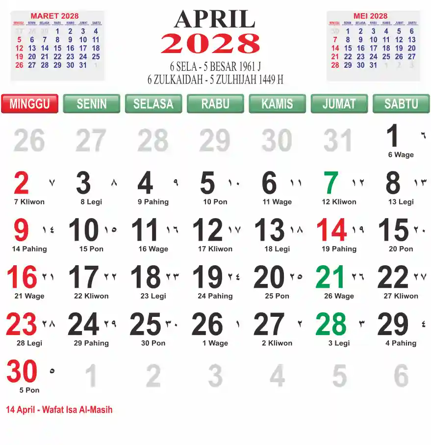 Template kalender 2028 lembaran besar jumbo yang mudah di baca dari jarak jauh. Kalender ini biasanya di cetak 1 lembar per bulan.