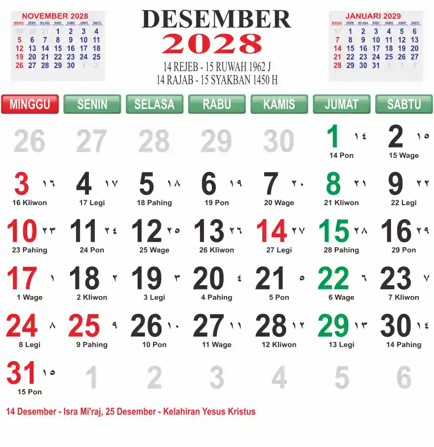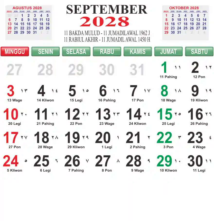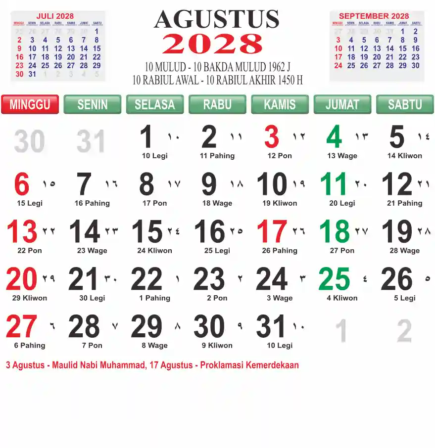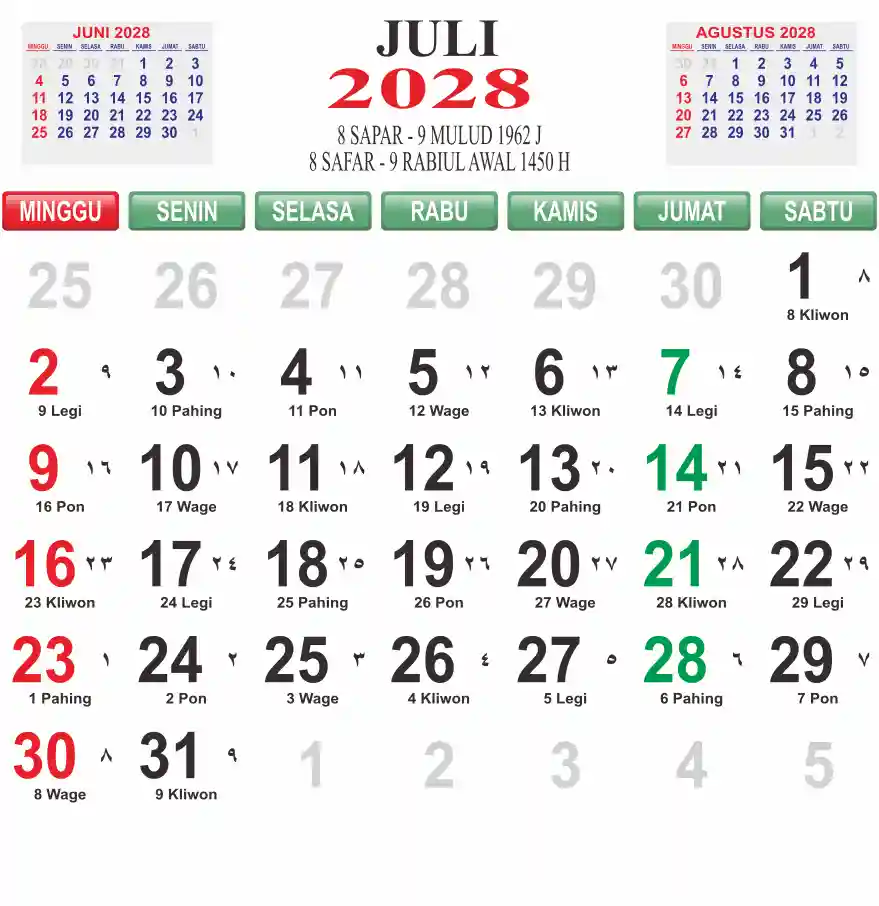 Template kalender 2028 lembaran besar jumbo yang mudah di baca dari jarak jauh. Kalender ini biasanya di cetak 1 lembar per bulan.
