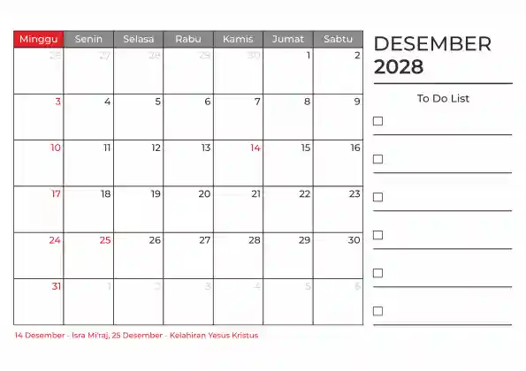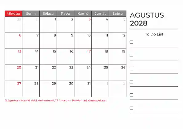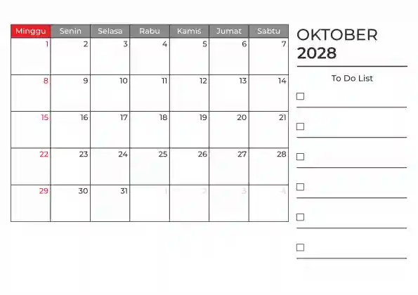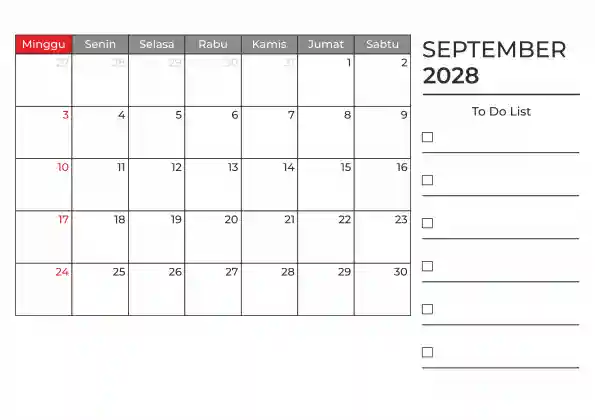 Template kalender 2028 duduk planner. Ada space kosong yang bisa di isi untuk menulis catatan dan ada space untuk menulis to do list.