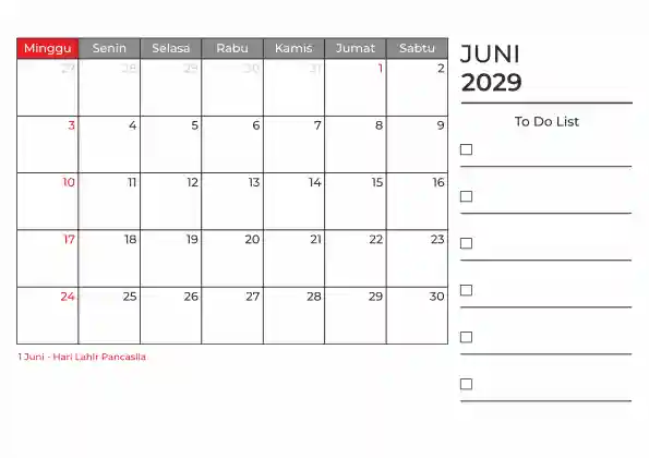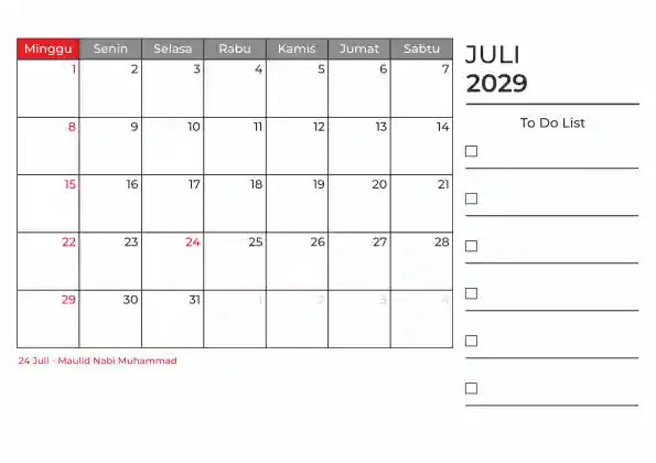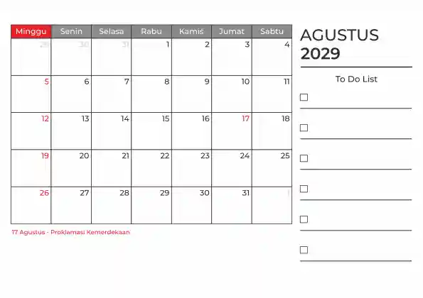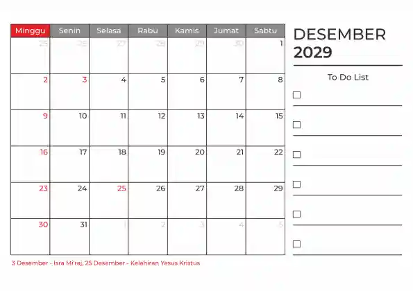Template kalender 2029 duduk planner. Ada space kosong yang bisa di isi untuk menulis catatan dan ada space untuk menulis to do list.