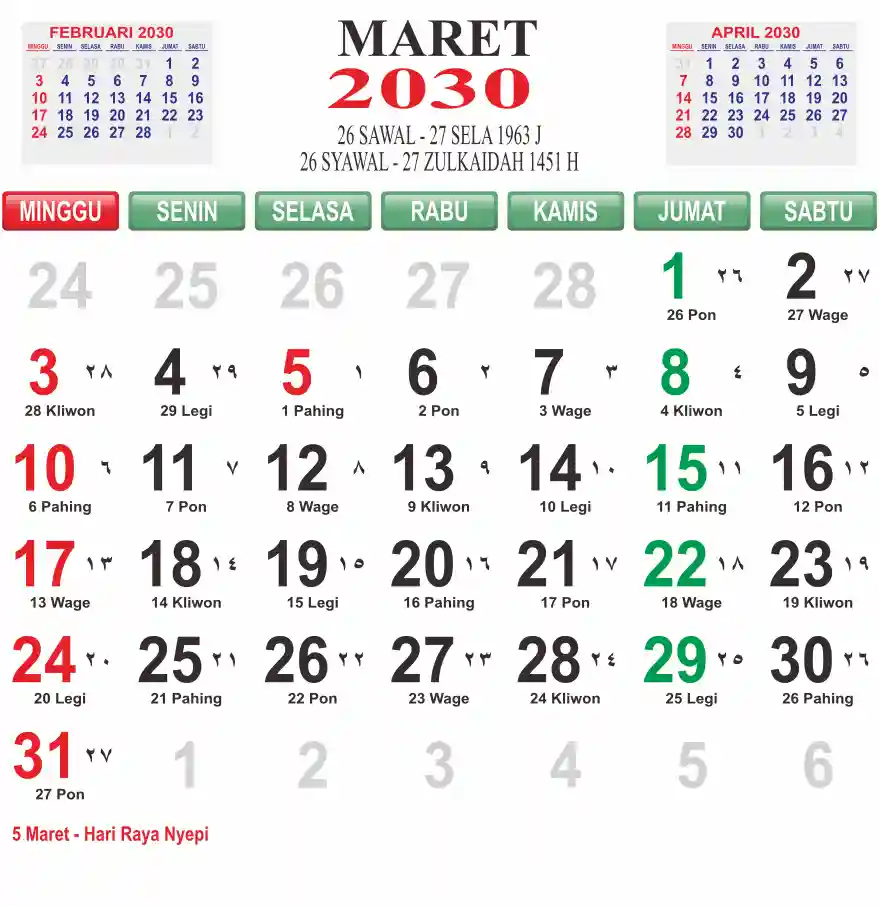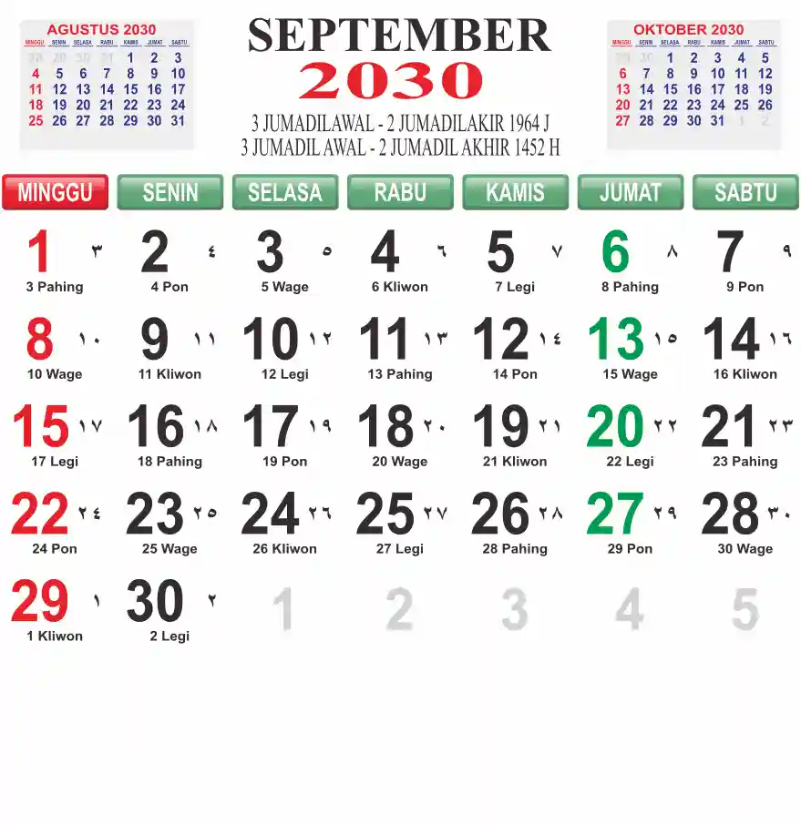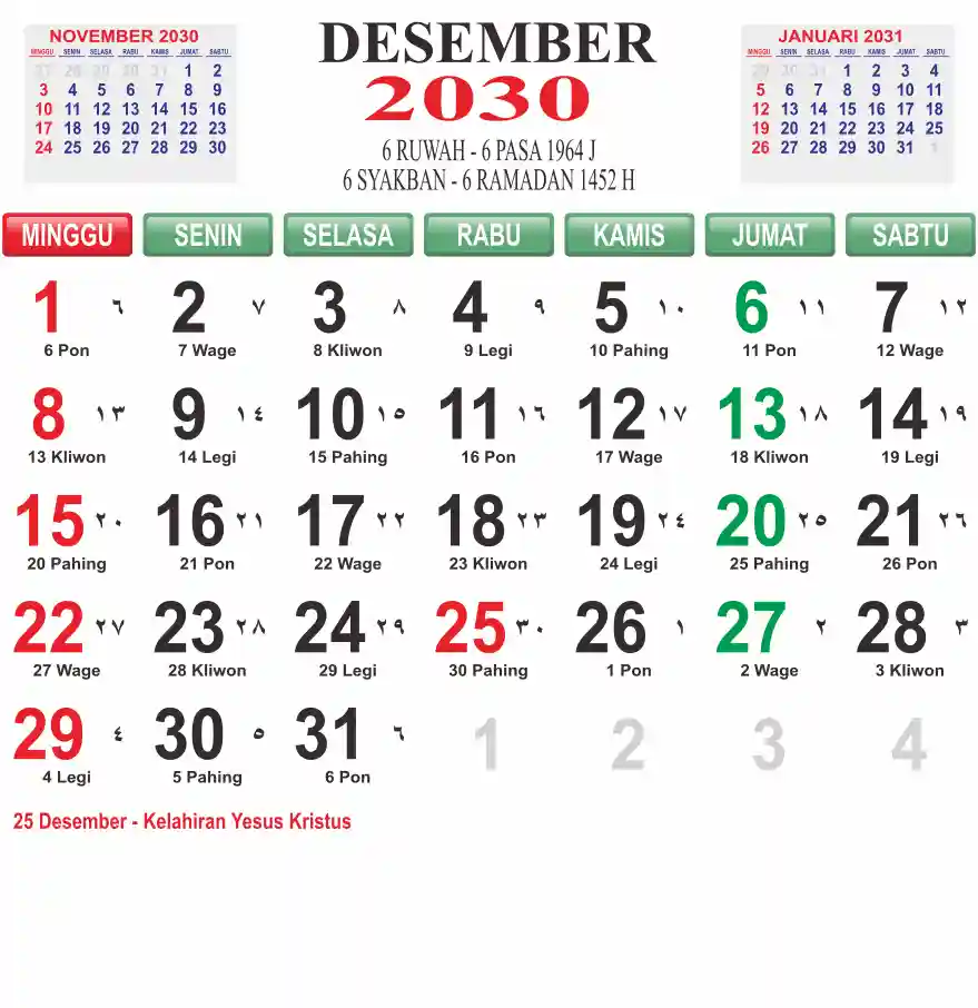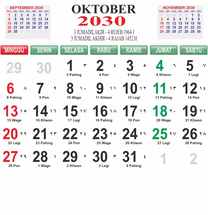Template kalender 2030 lembaran besar jumbo yang mudah di baca dari jarak jauh. Kalender ini biasanya di cetak 1 lembar per bulan.