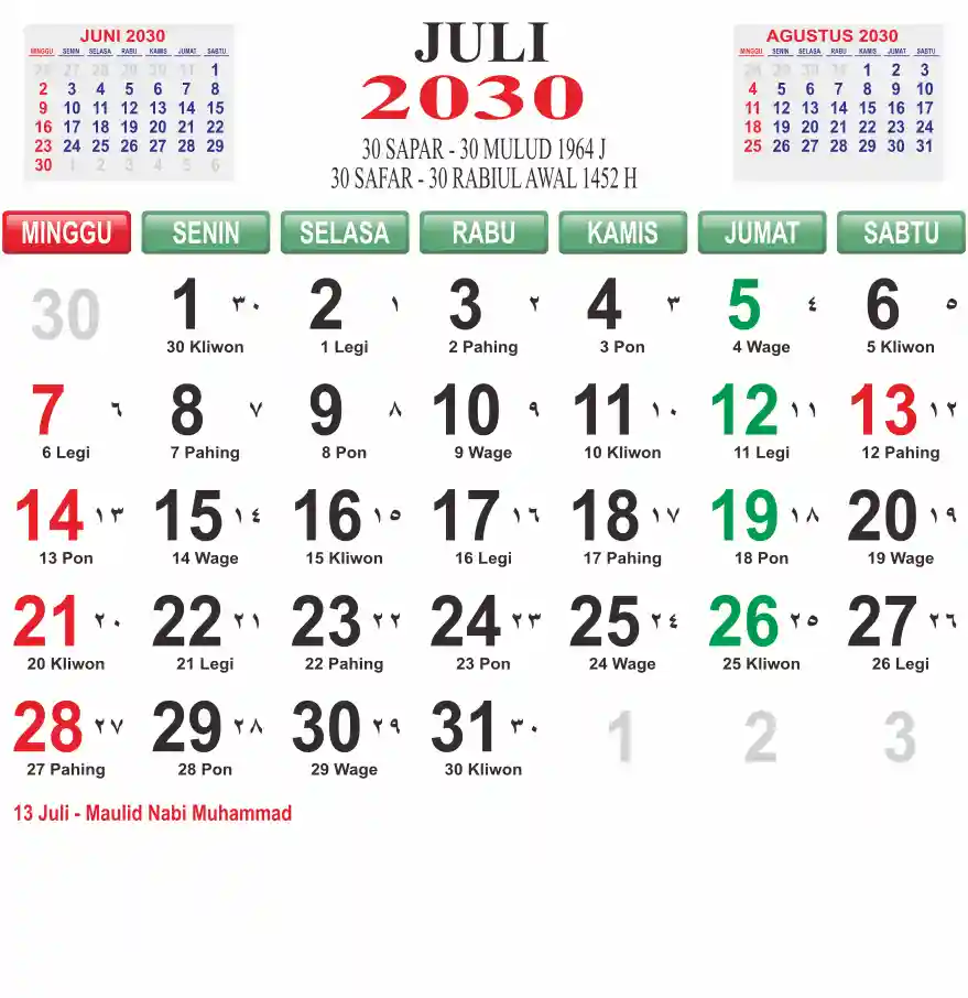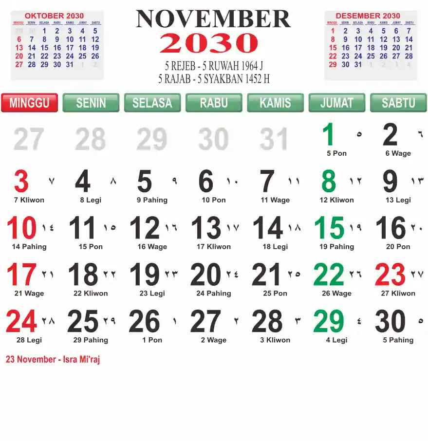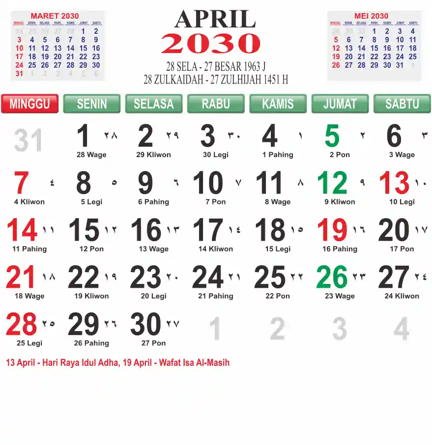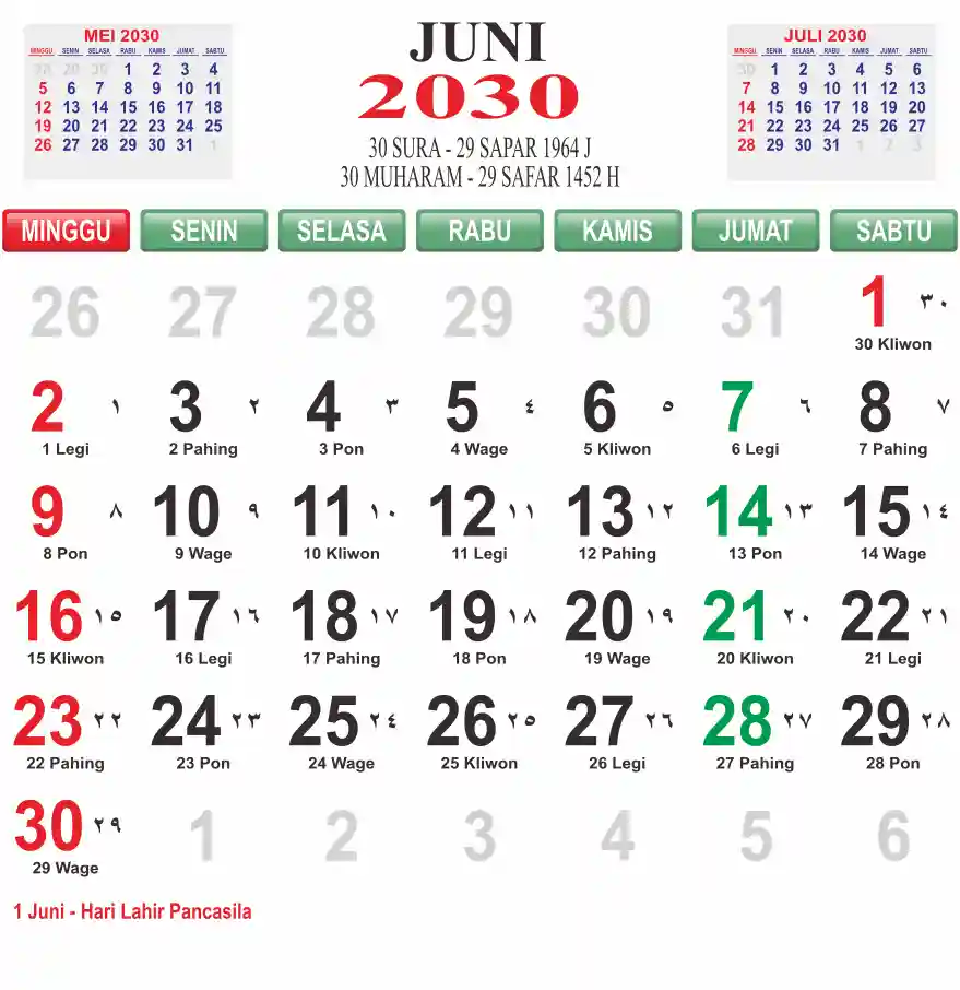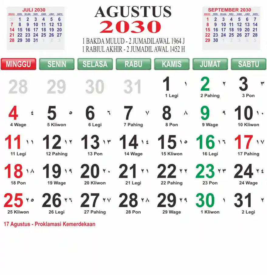 Template kalender 2030 lembaran besar jumbo yang mudah di baca dari jarak jauh. Kalender ini biasanya di cetak 1 lembar per bulan.