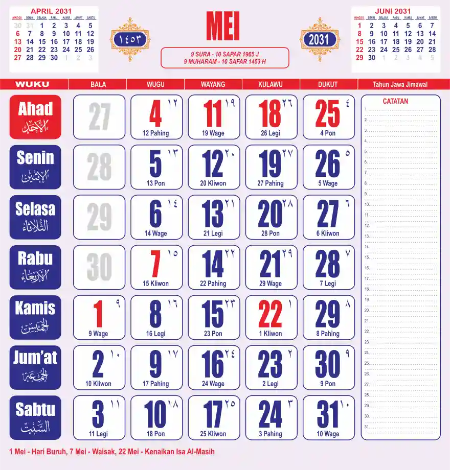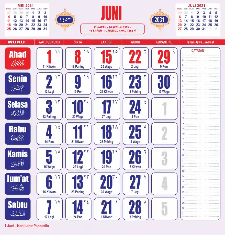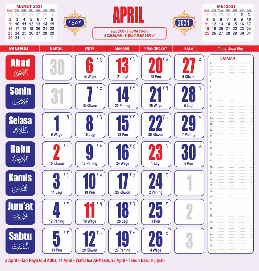 Template kalender 2031 lembaran besar jumbo yang sering dipakai oleh masyarakat jawa lengkap dengan wuku. Kalender ini biasanya di cetak 1 lembar per bulan.