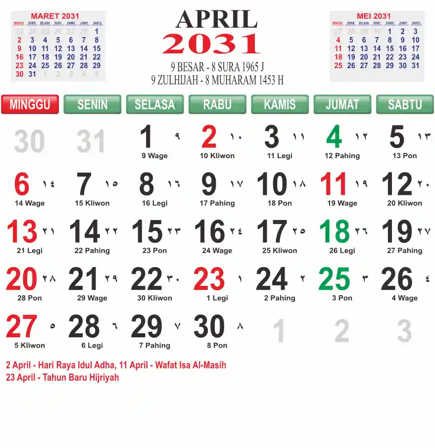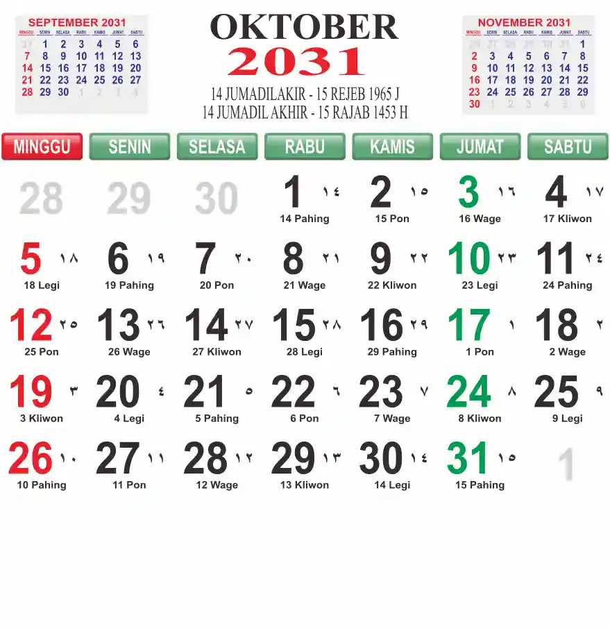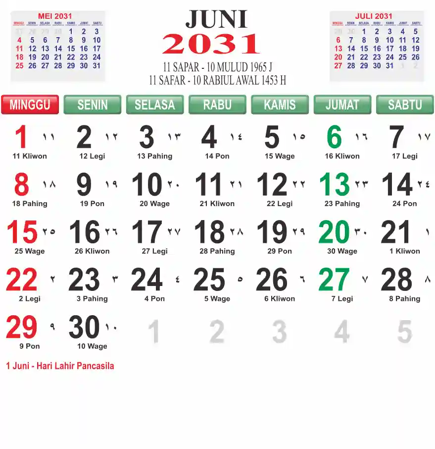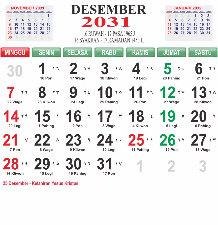 Template kalender 2031 lembaran besar jumbo yang mudah di baca dari jarak jauh. Kalender ini biasanya di cetak 1 lembar per bulan.