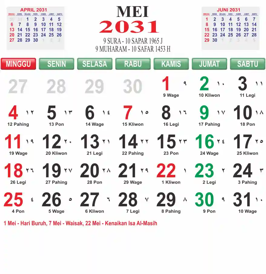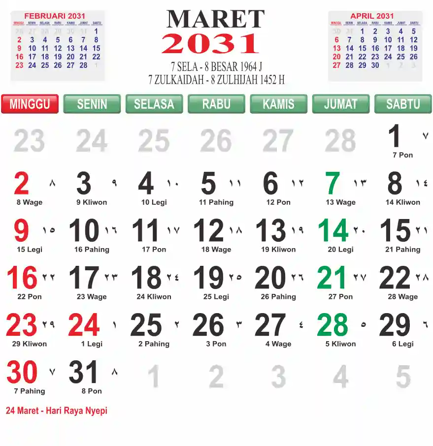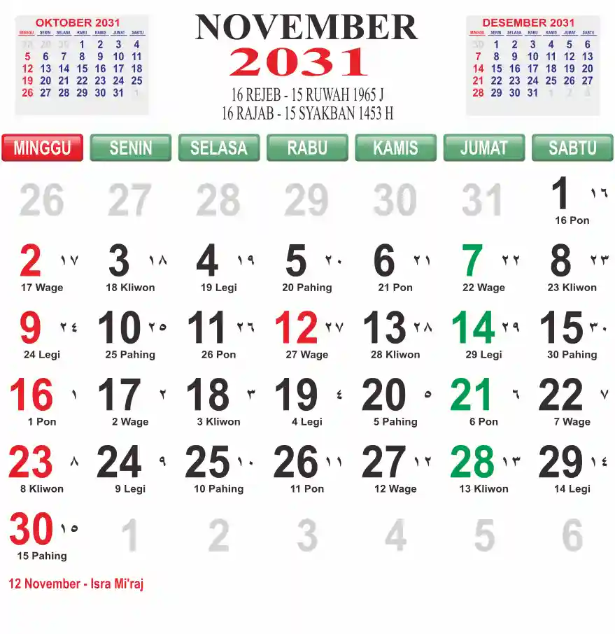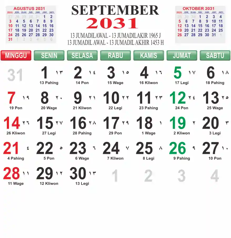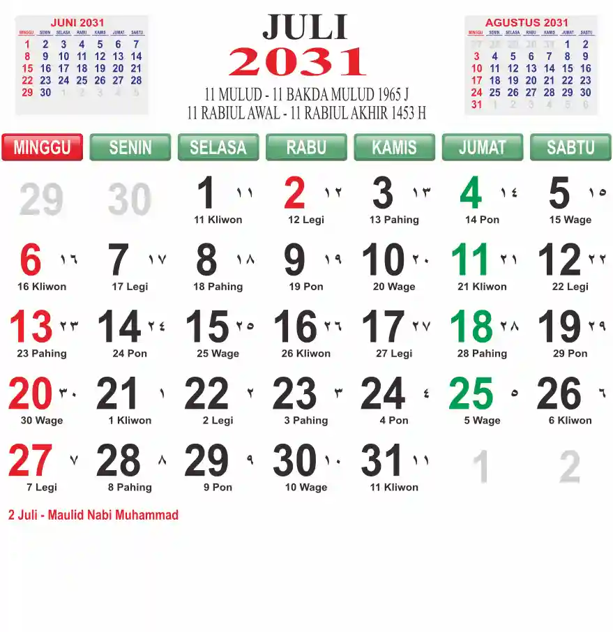Template kalender 2031 lembaran besar jumbo yang mudah di baca dari jarak jauh. Kalender ini biasanya di cetak 1 lembar per bulan.
