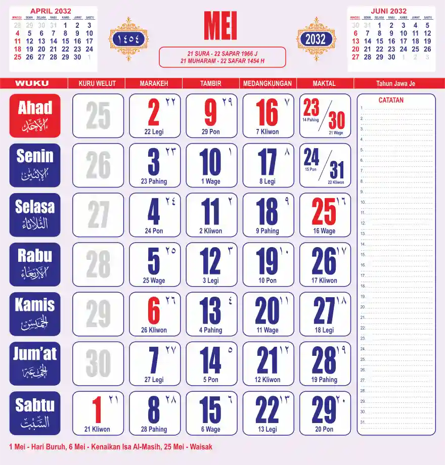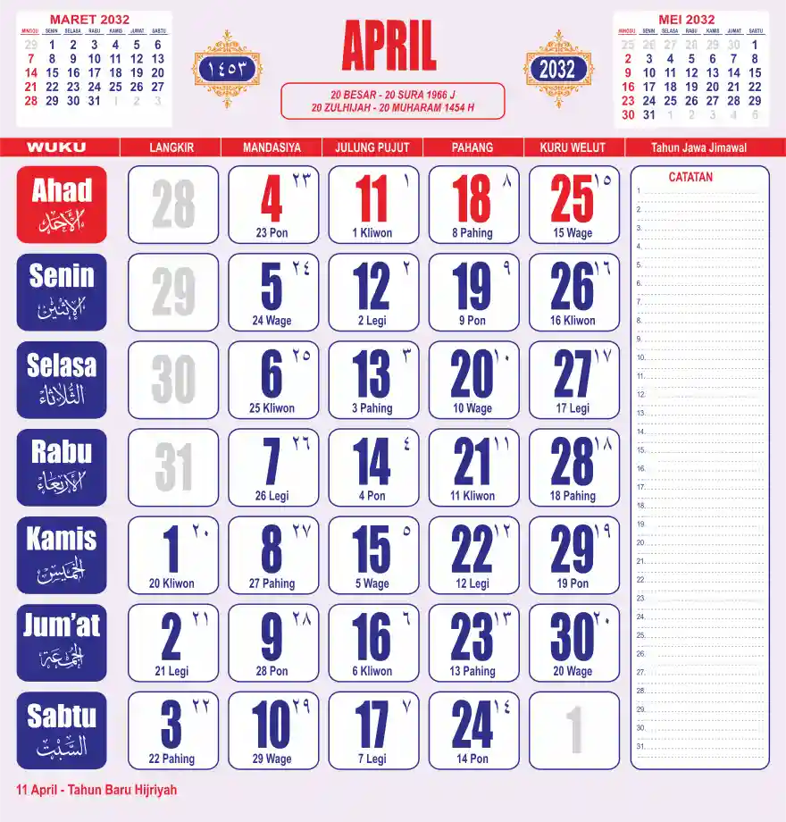 Template kalender 2032 lembaran besar jumbo yang sering dipakai oleh masyarakat jawa lengkap dengan wuku. Kalender ini biasanya di cetak 1 lembar per bulan.