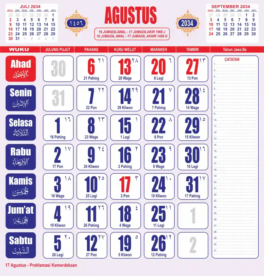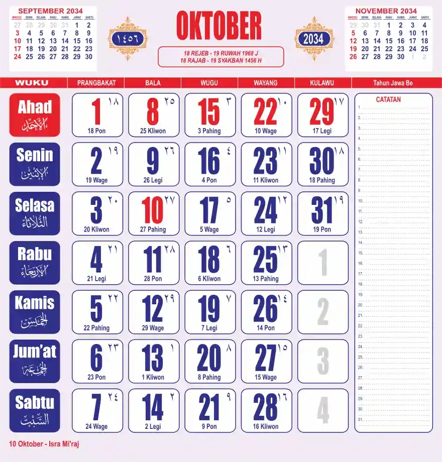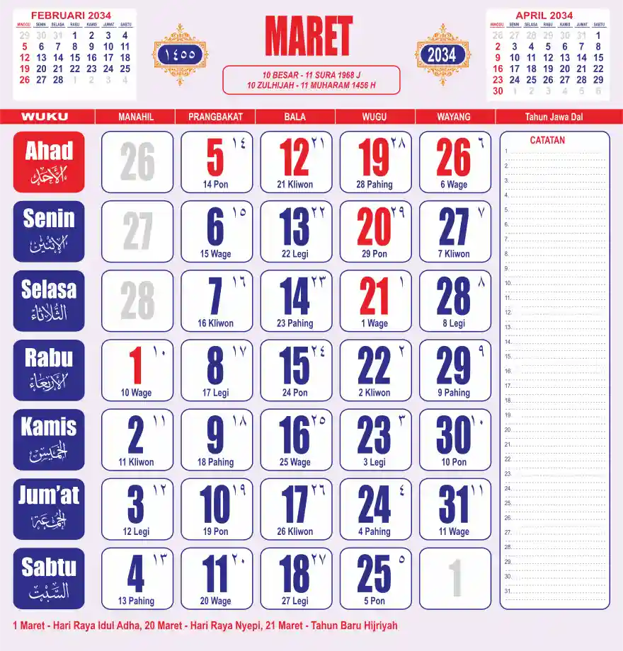 Template kalender 2034 lembaran besar jumbo yang sering dipakai oleh masyarakat jawa lengkap dengan wuku. Kalender ini biasanya di cetak 1 lembar per bulan.