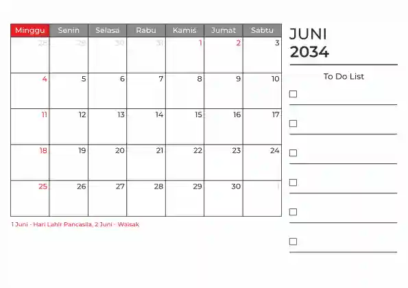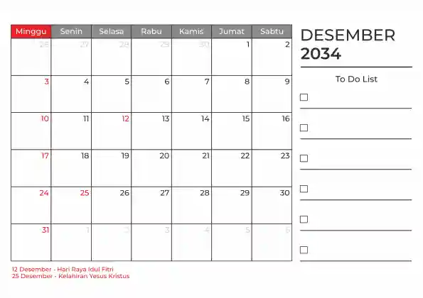 Template kalender 2034 duduk planner. Ada space kosong yang bisa di isi untuk menulis catatan dan ada space untuk menulis to do list.