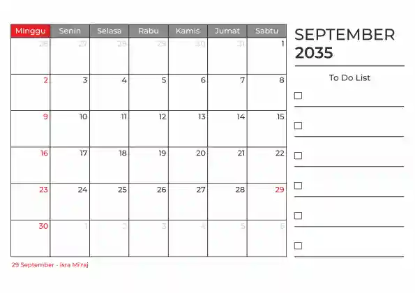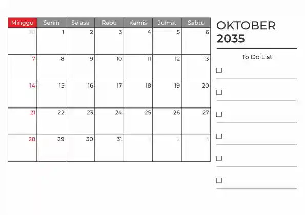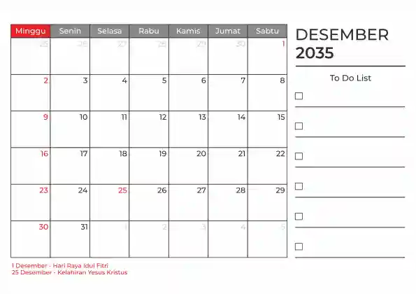 Template kalender 2035 duduk planner. Ada space kosong yang bisa di isi untuk menulis catatan dan ada space untuk menulis to do list.