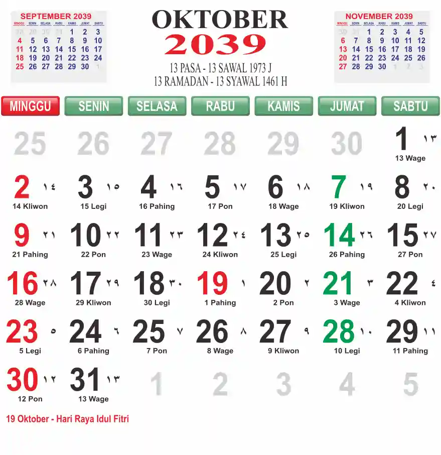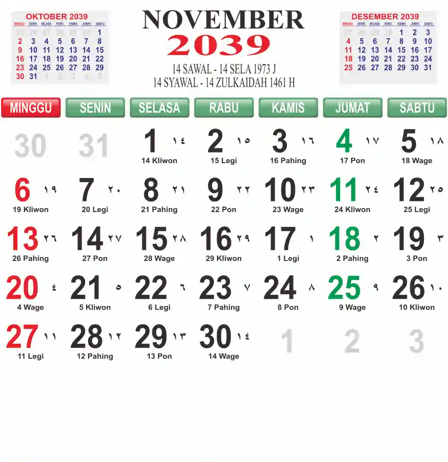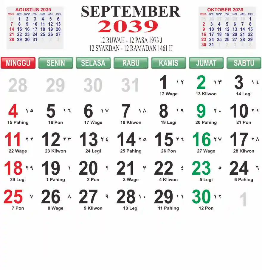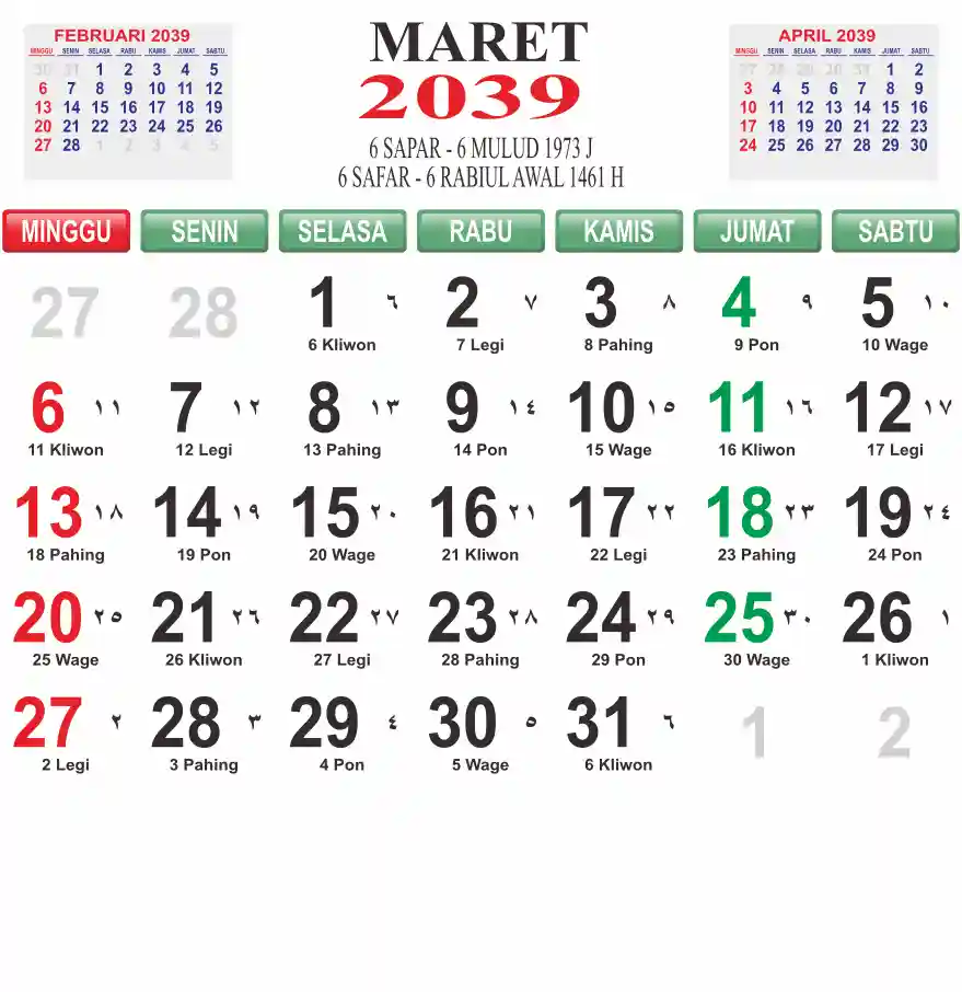 Template kalender 2039 lembaran besar jumbo yang mudah di baca dari jarak jauh. Kalender ini biasanya di cetak 1 lembar per bulan.