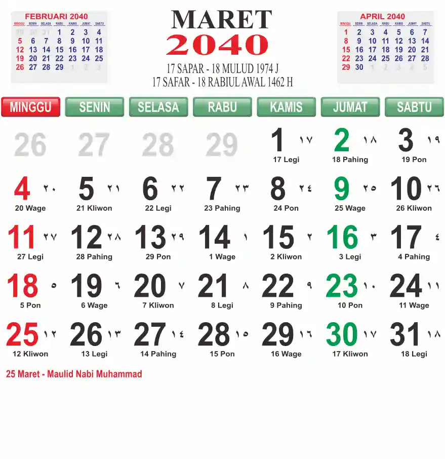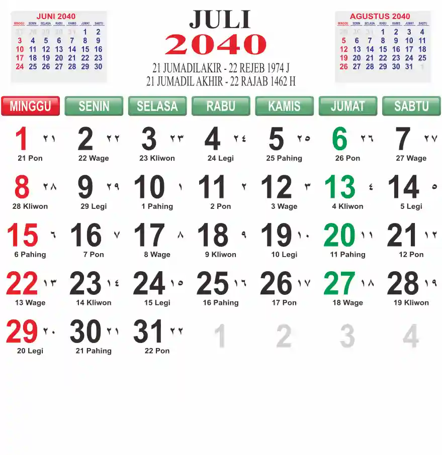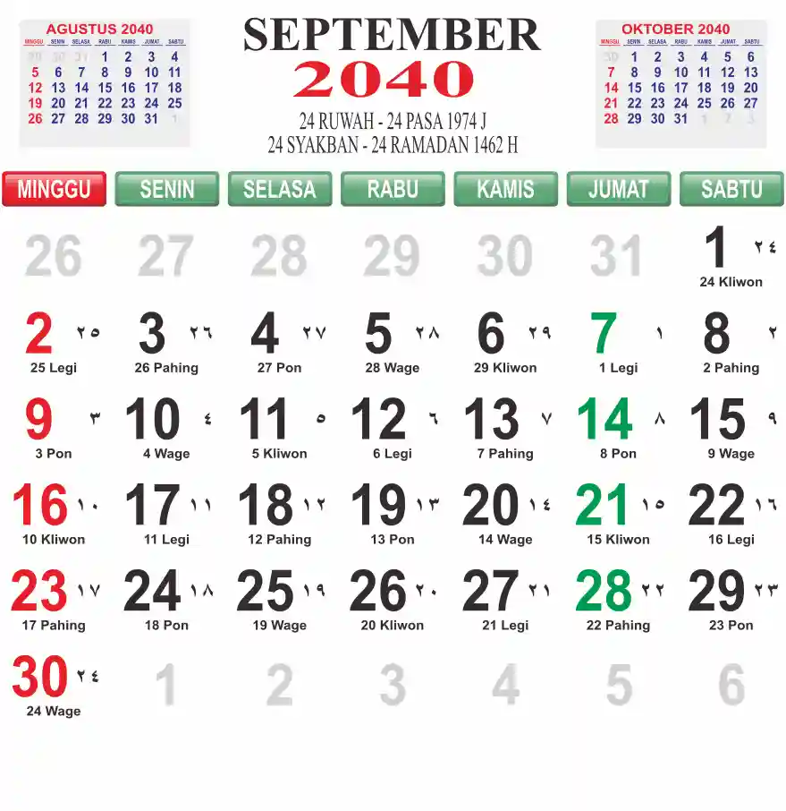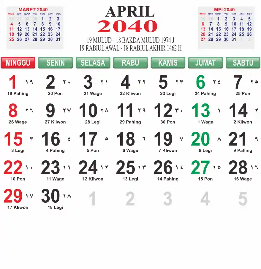Template kalender 2040 lembaran besar jumbo yang mudah di baca dari jarak jauh. Kalender ini biasanya di cetak 1 lembar per bulan.