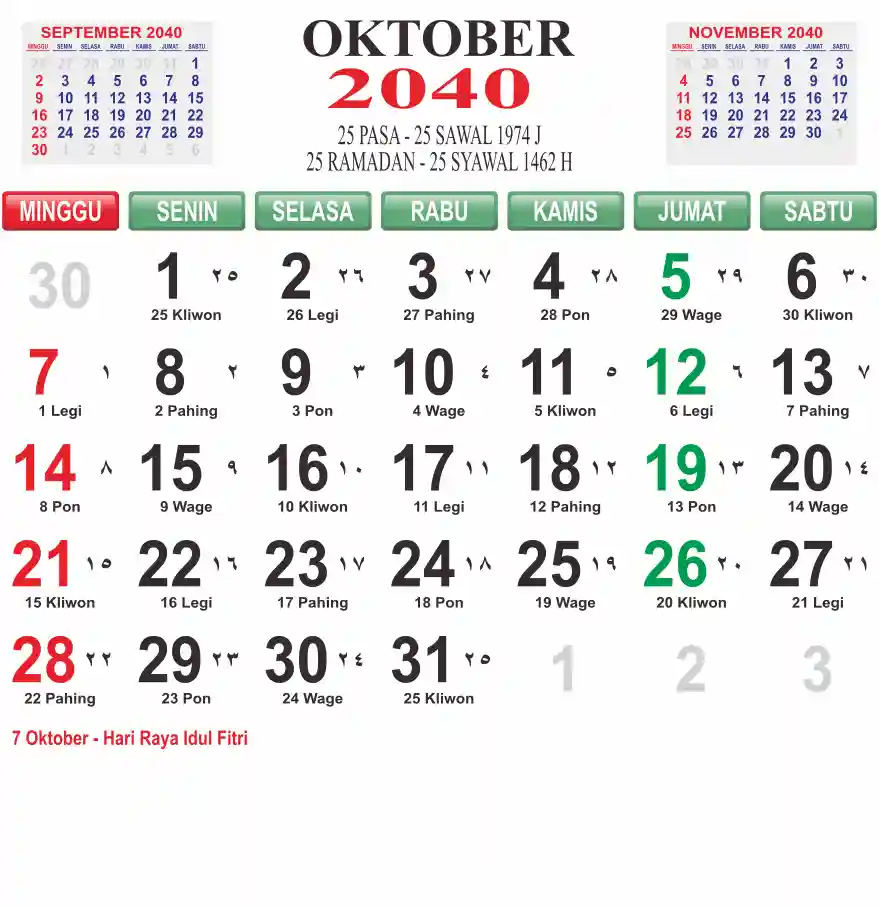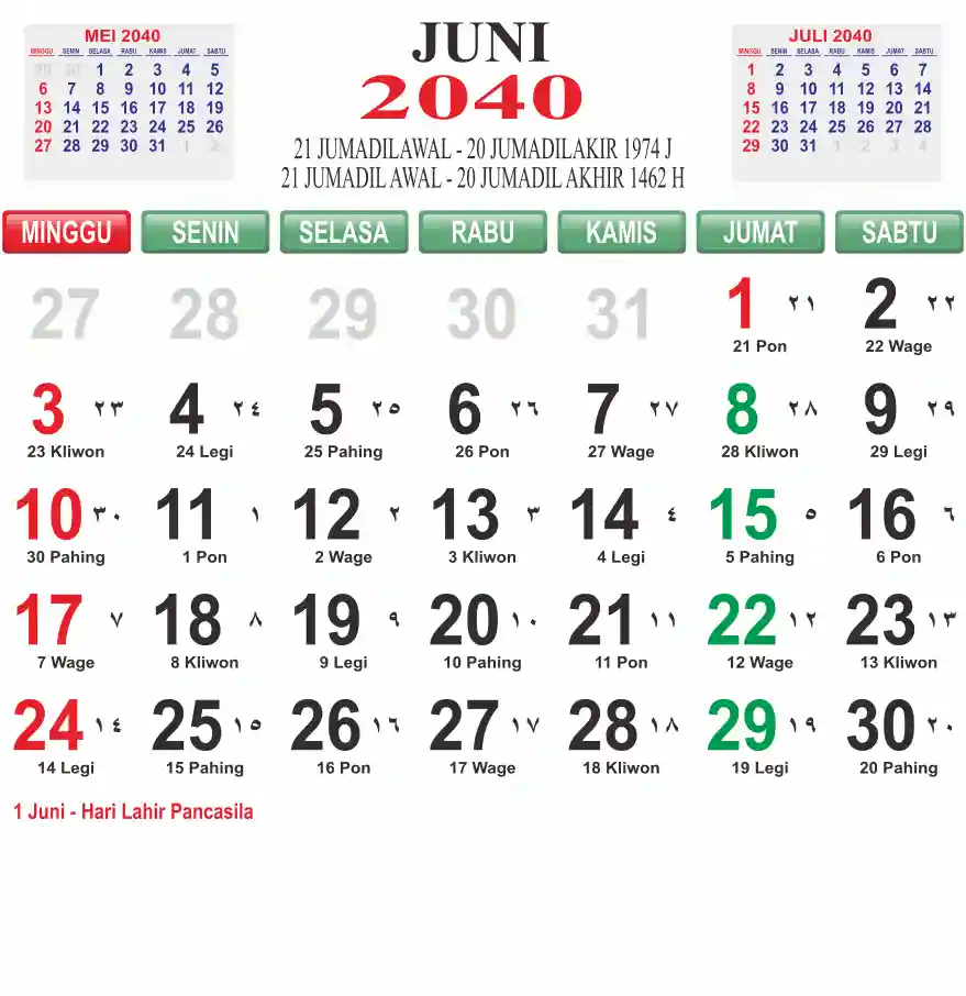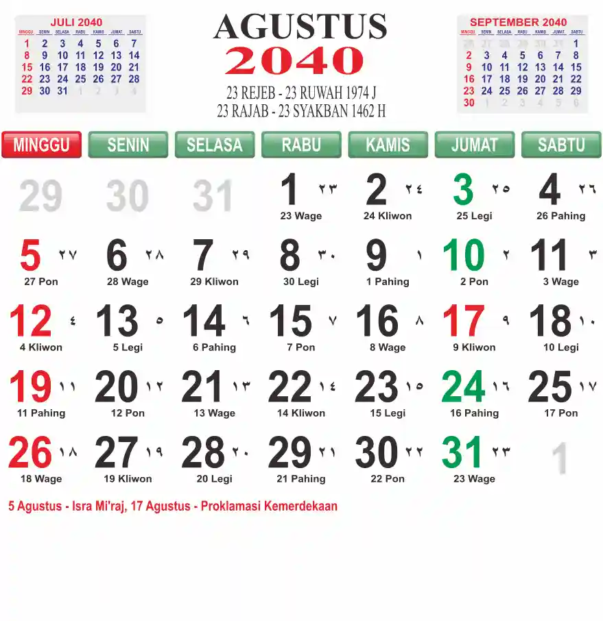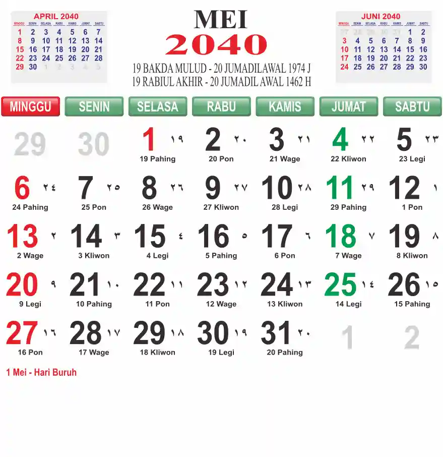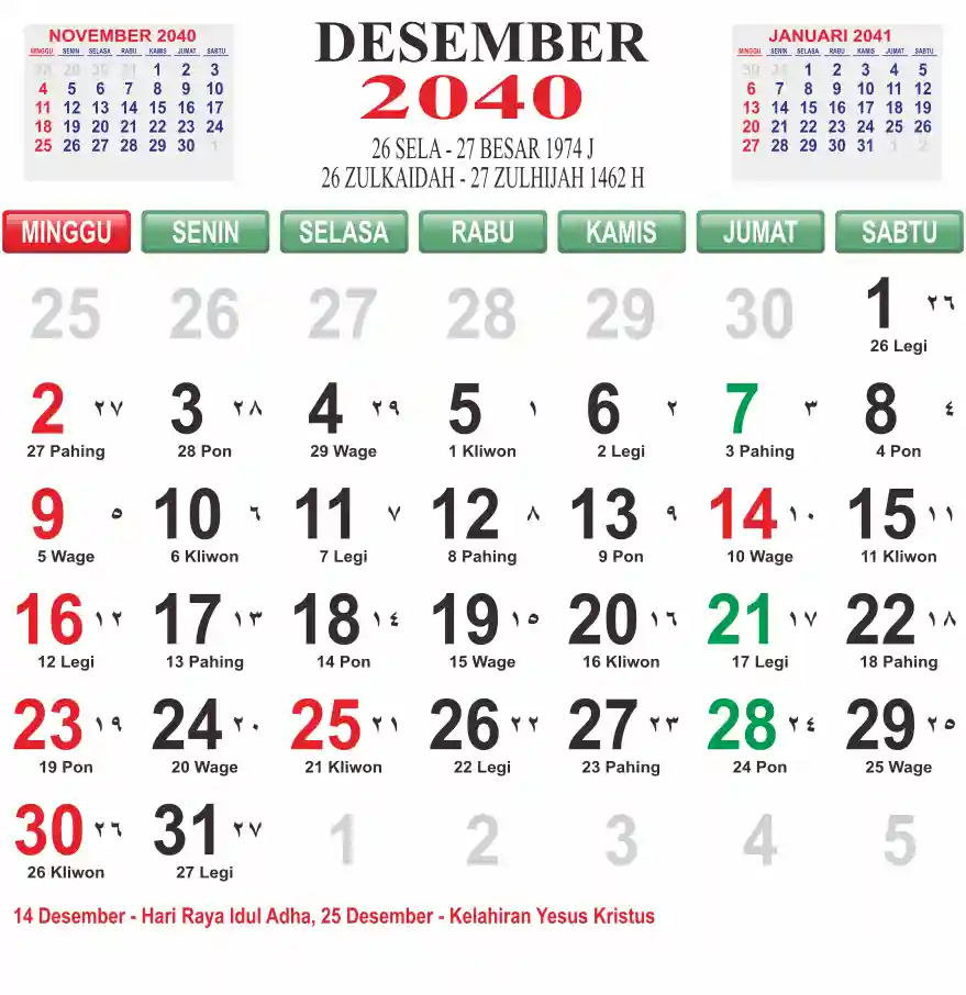 Template kalender 2040 lembaran besar jumbo yang mudah di baca dari jarak jauh. Kalender ini biasanya di cetak 1 lembar per bulan.