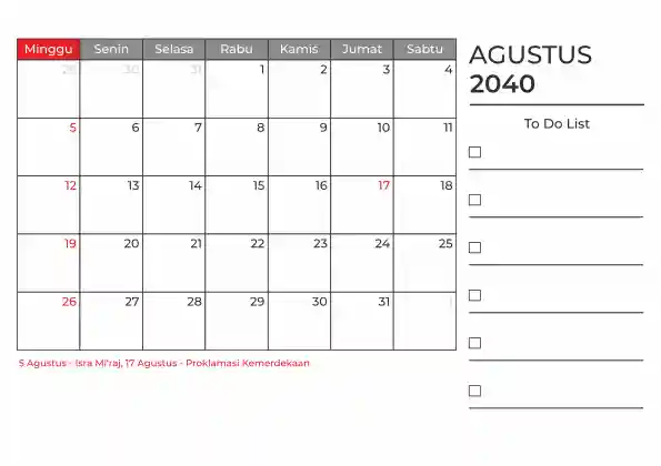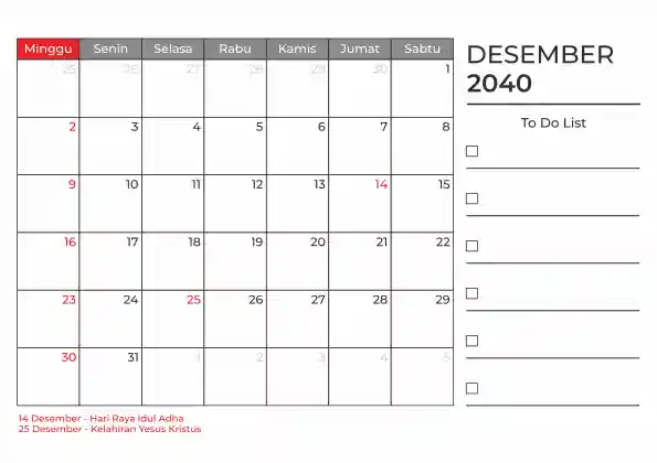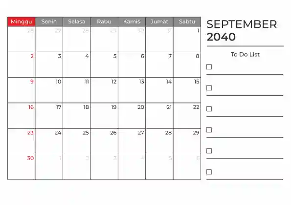 Template kalender 2040 duduk planner. Ada space kosong yang bisa di isi untuk menulis catatan dan ada space untuk menulis to do list.