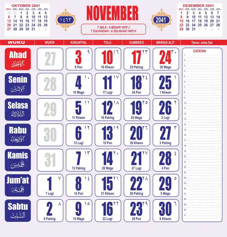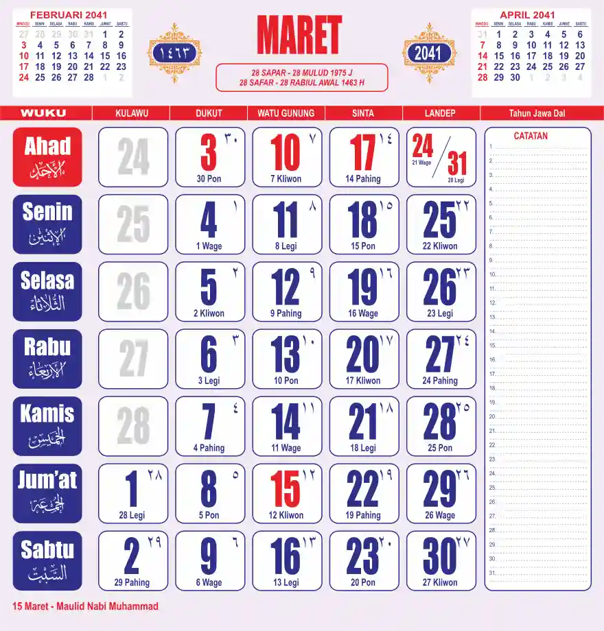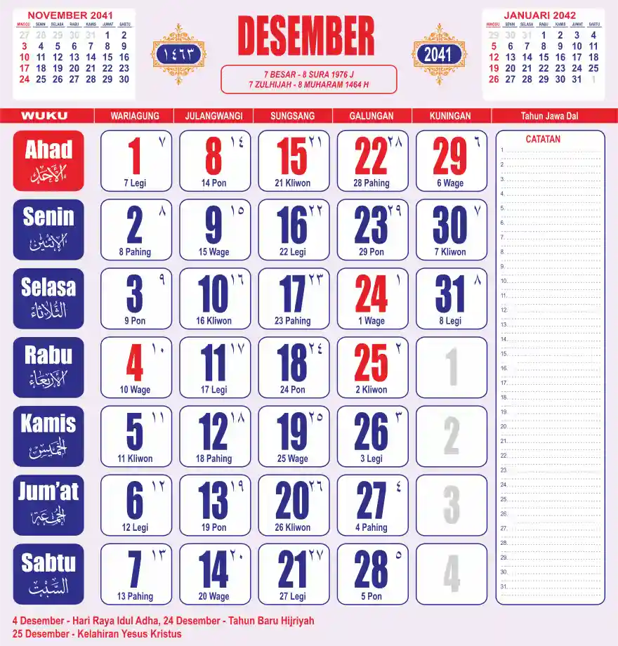 Template kalender 2041 lembaran besar jumbo yang sering dipakai oleh masyarakat jawa lengkap dengan wuku. Kalender ini biasanya di cetak 1 lembar per bulan.