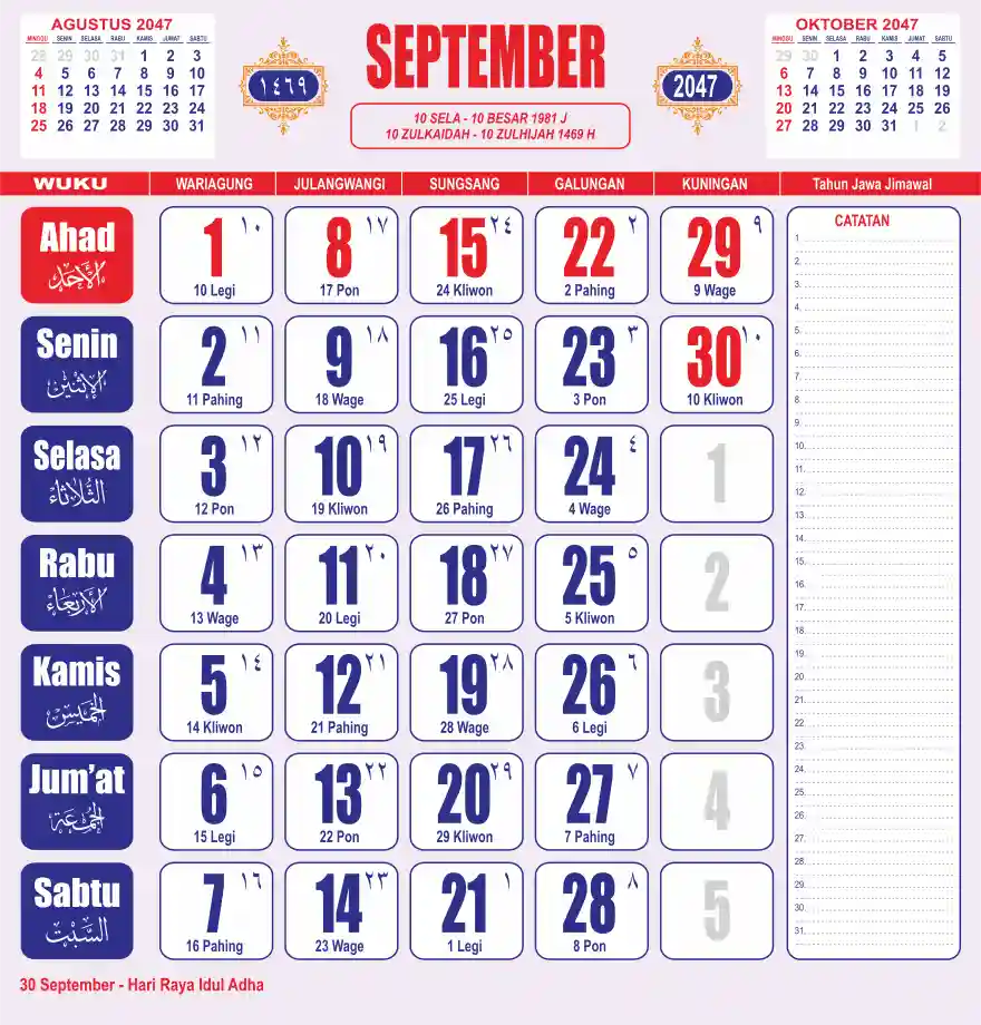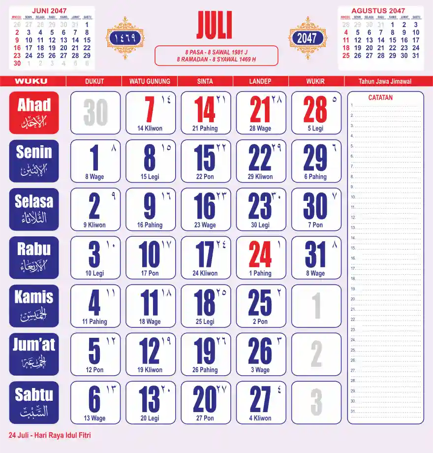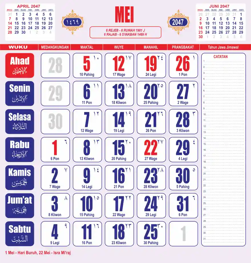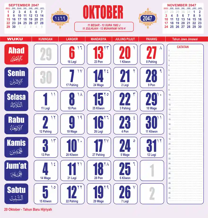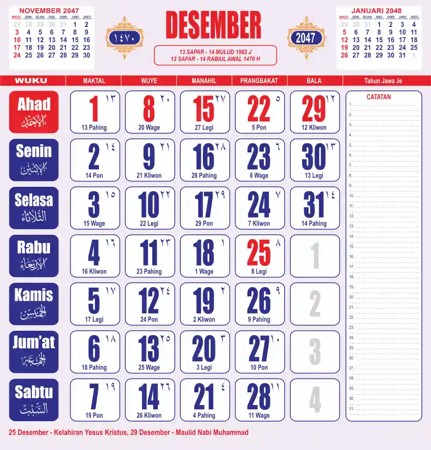 Template kalender 2047 lembaran besar jumbo yang sering dipakai oleh masyarakat jawa lengkap dengan wuku. Kalender ini biasanya di cetak 1 lembar per bulan.
