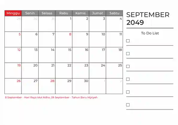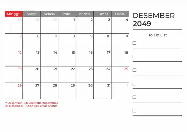 Template kalender 2049 duduk planner. Ada space kosong yang bisa di isi untuk menulis catatan dan ada space untuk menulis to do list.