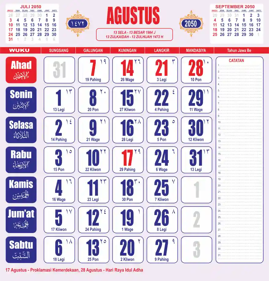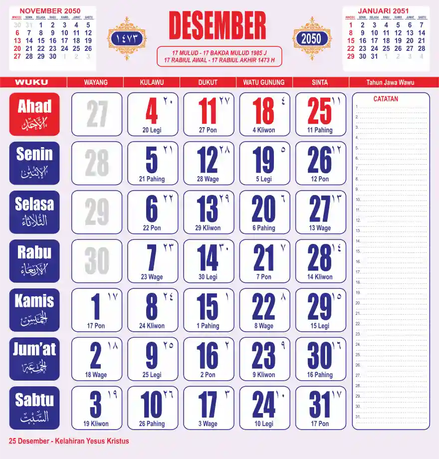 Template kalender 2050 lembaran besar jumbo yang sering dipakai oleh masyarakat jawa lengkap dengan wuku. Kalender ini biasanya di cetak 1 lembar per bulan.