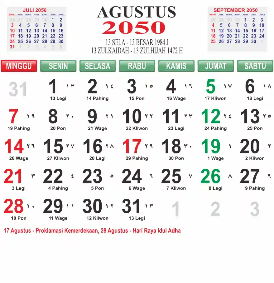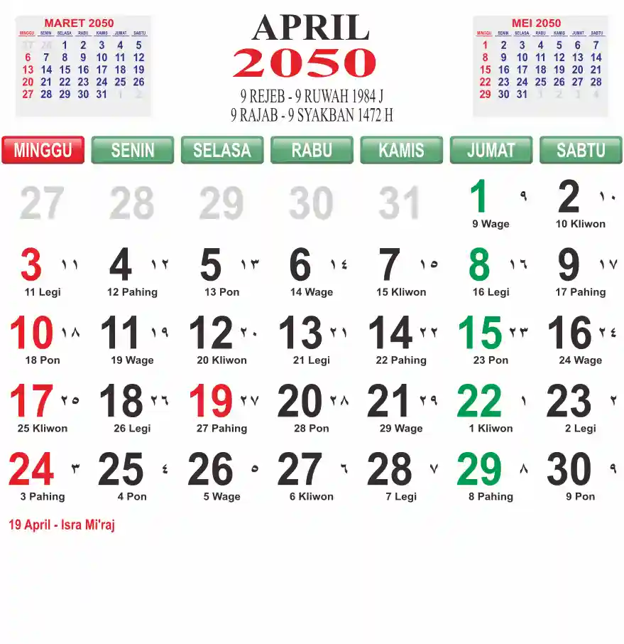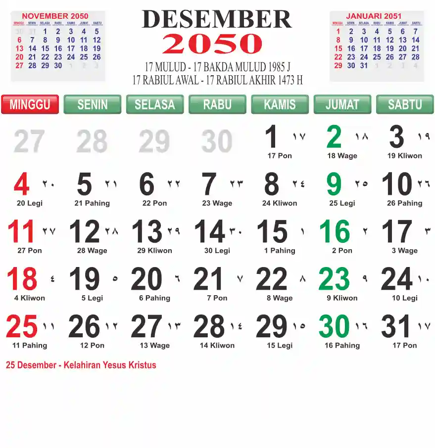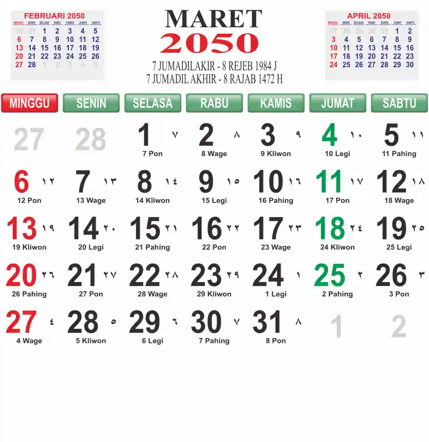 Template kalender 2050 lembaran besar jumbo yang mudah di baca dari jarak jauh. Kalender ini biasanya di cetak 1 lembar per bulan.