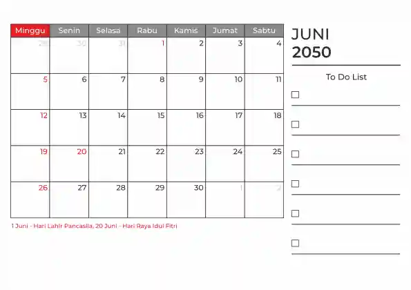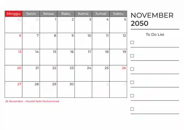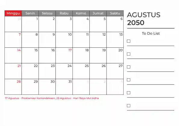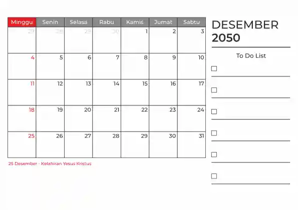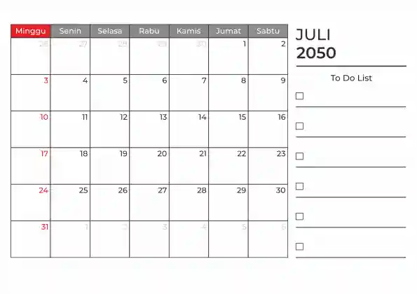 Template kalender 2050 duduk planner. Ada space kosong yang bisa di isi untuk menulis catatan dan ada space untuk menulis to do list.