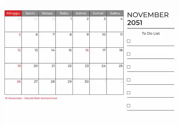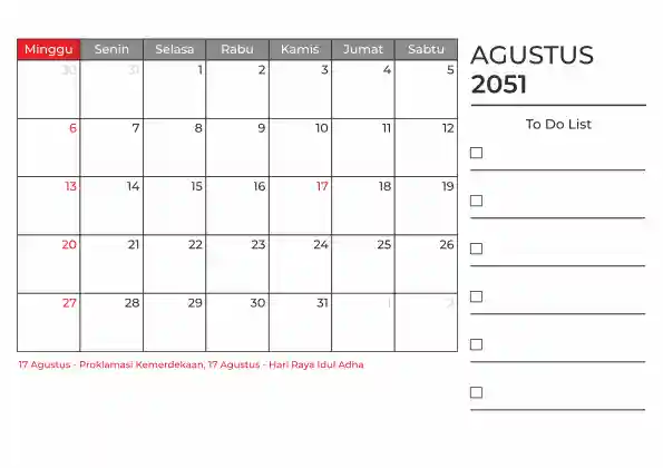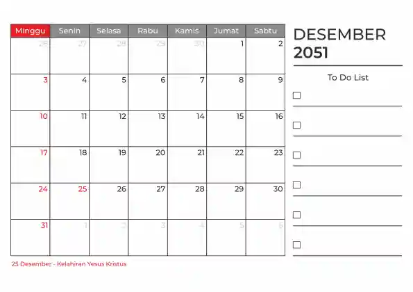 Template kalender 2051 duduk planner. Ada space kosong yang bisa di isi untuk menulis catatan dan ada space untuk menulis to do list.