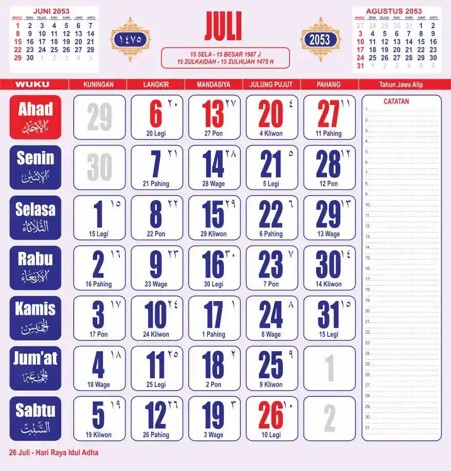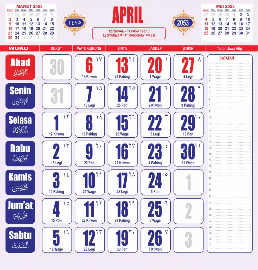 Template kalender 2053 lembaran besar jumbo yang sering dipakai oleh masyarakat jawa lengkap dengan wuku. Kalender ini biasanya di cetak 1 lembar per bulan.