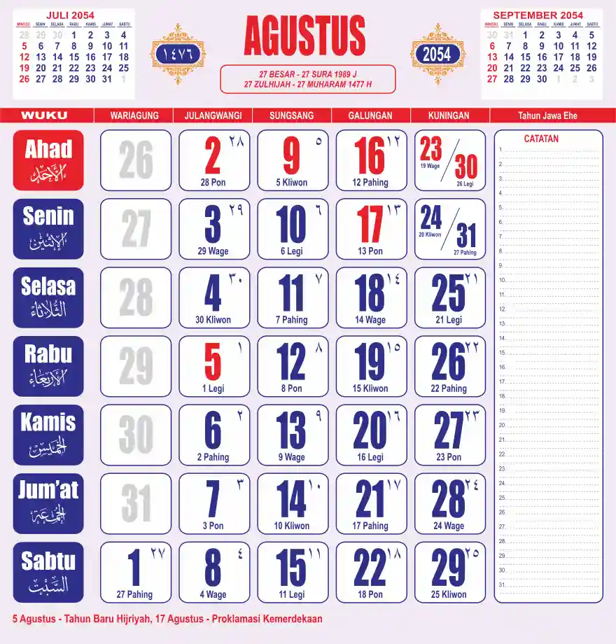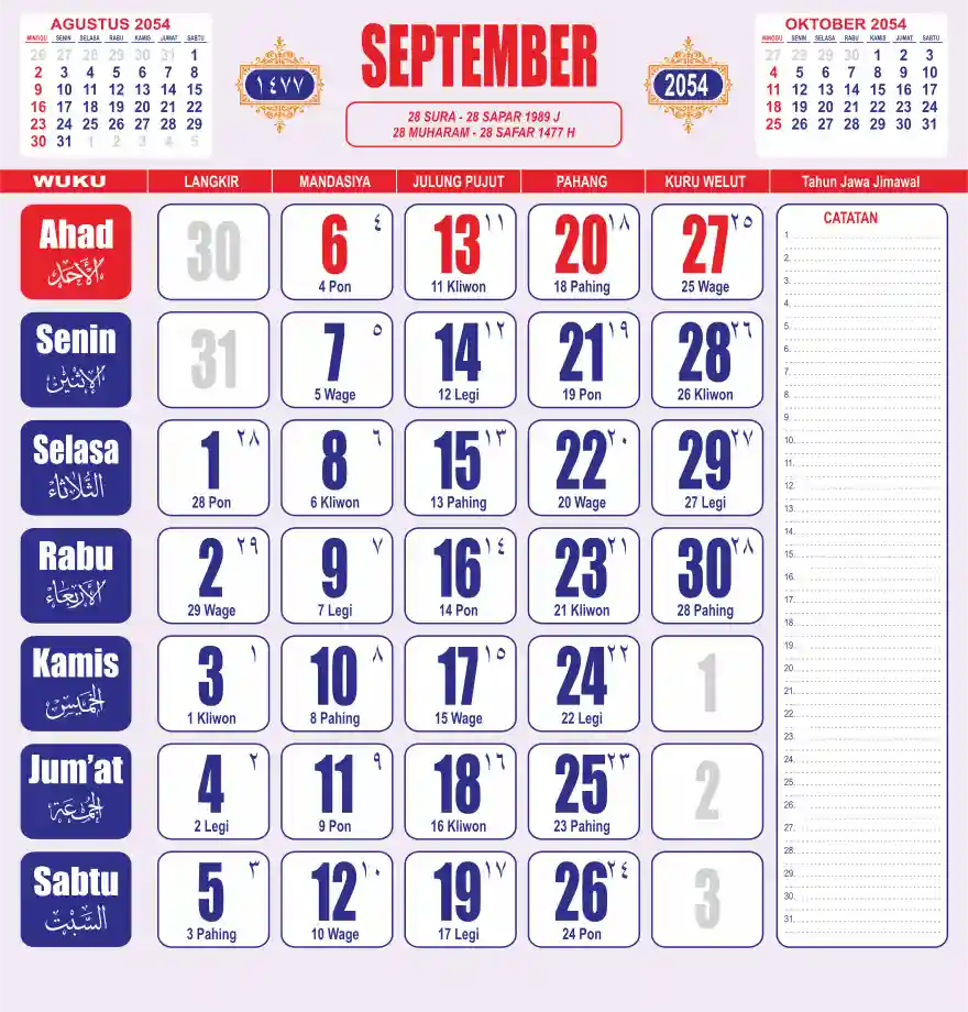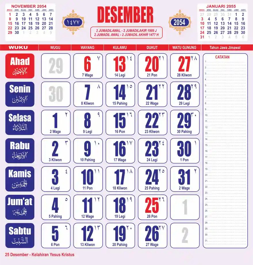 Template kalender 2054 lembaran besar jumbo yang sering dipakai oleh masyarakat jawa lengkap dengan wuku. Kalender ini biasanya di cetak 1 lembar per bulan.