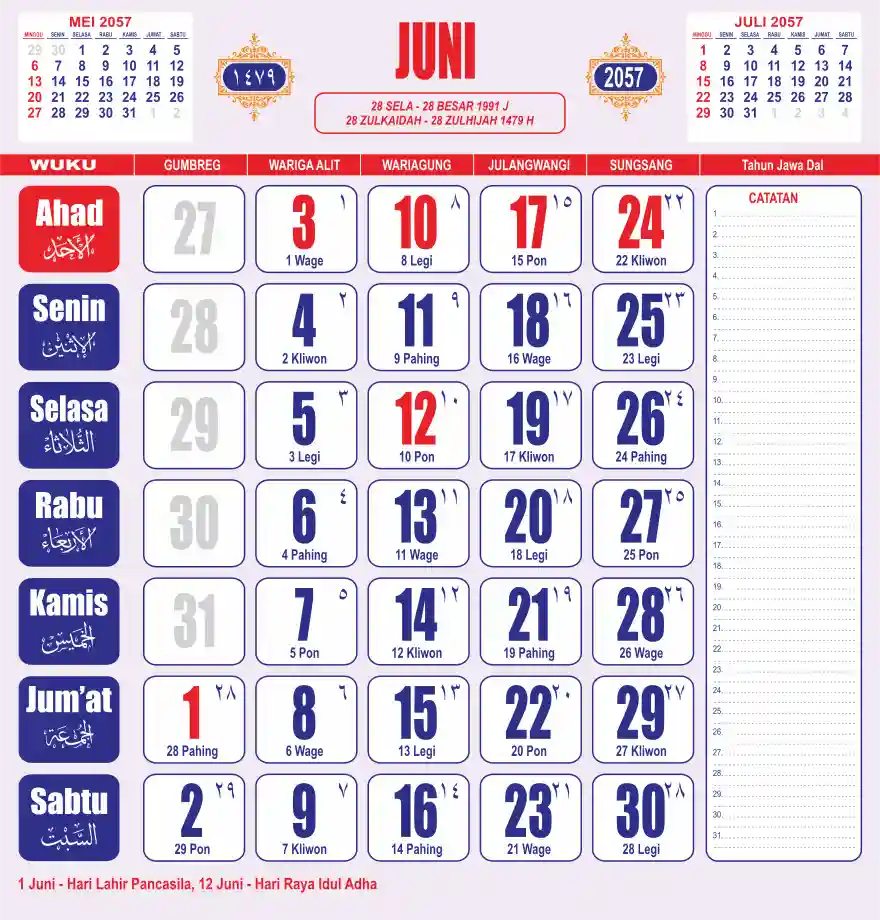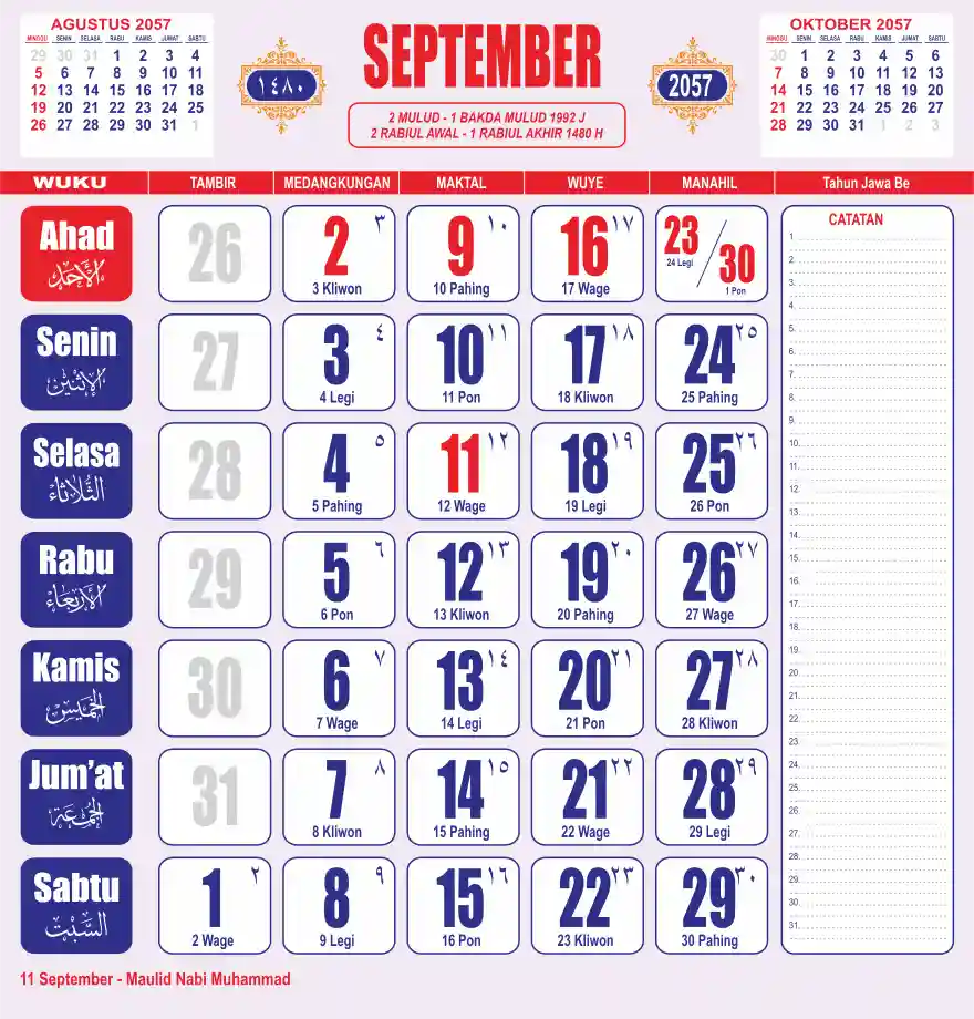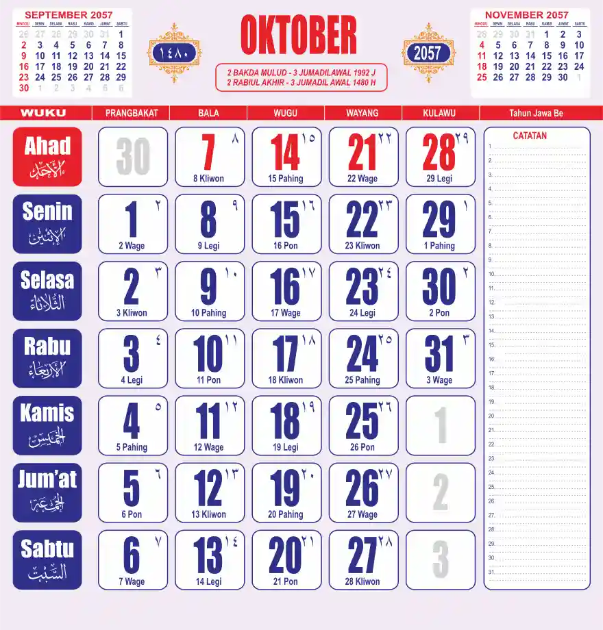 Template kalender 2057 lembaran besar jumbo yang sering dipakai oleh masyarakat jawa lengkap dengan wuku. Kalender ini biasanya di cetak 1 lembar per bulan.