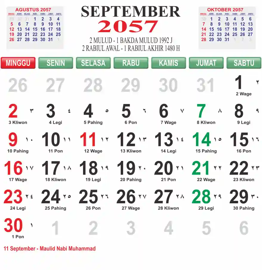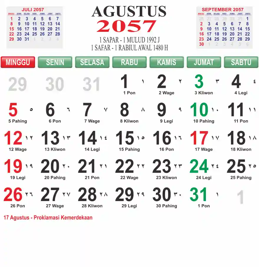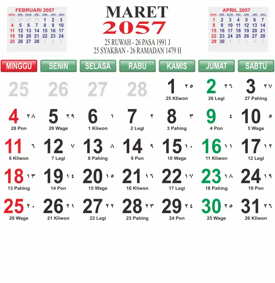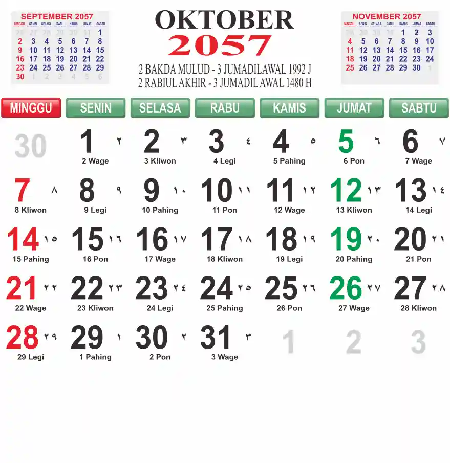 Template kalender 2057 lembaran besar jumbo yang mudah di baca dari jarak jauh. Kalender ini biasanya di cetak 1 lembar per bulan.