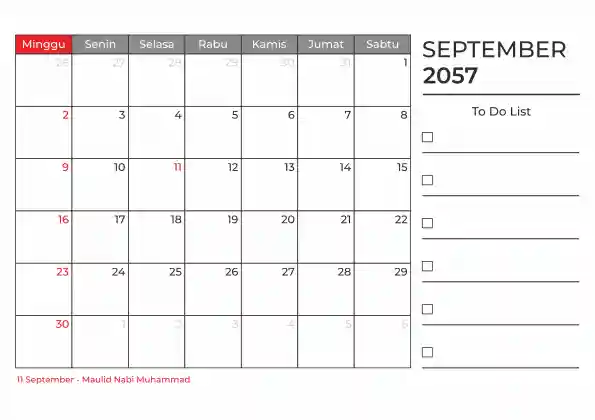 Template kalender 2057 duduk planner. Ada space kosong yang bisa di isi untuk menulis catatan dan ada space untuk menulis to do list.