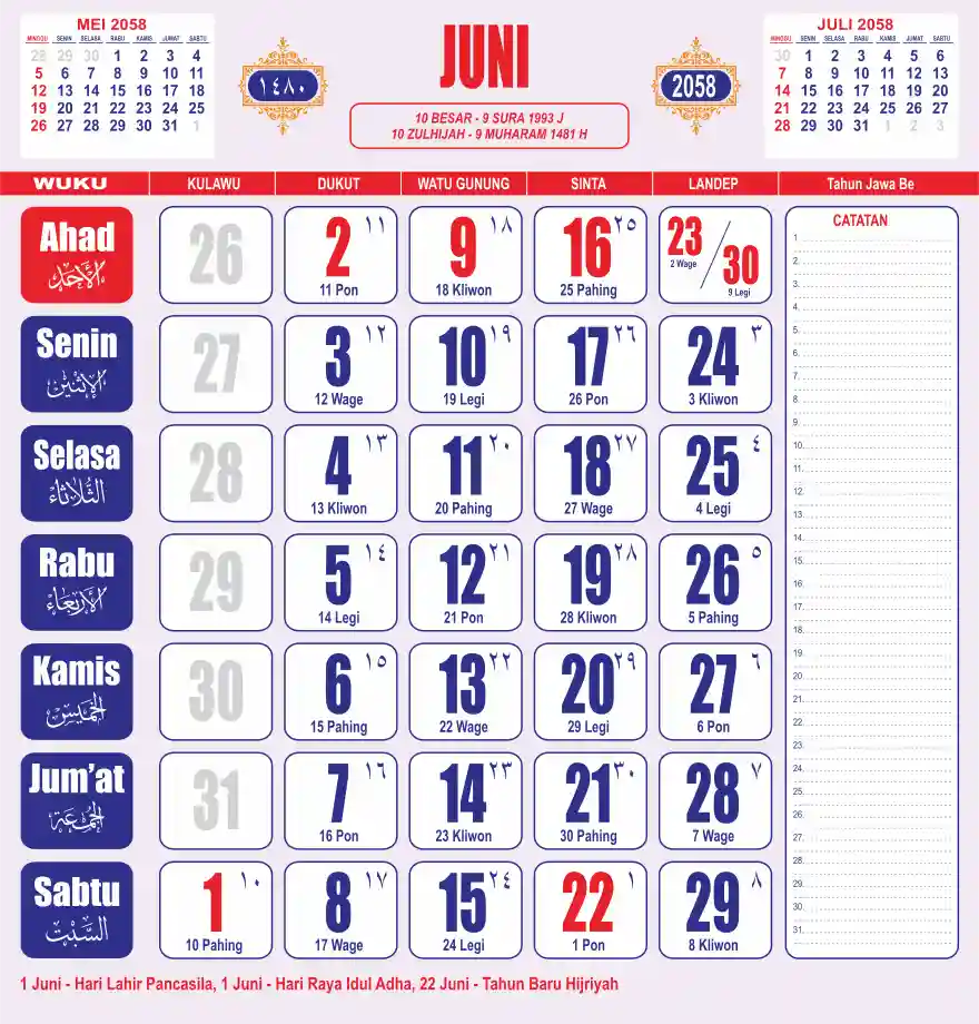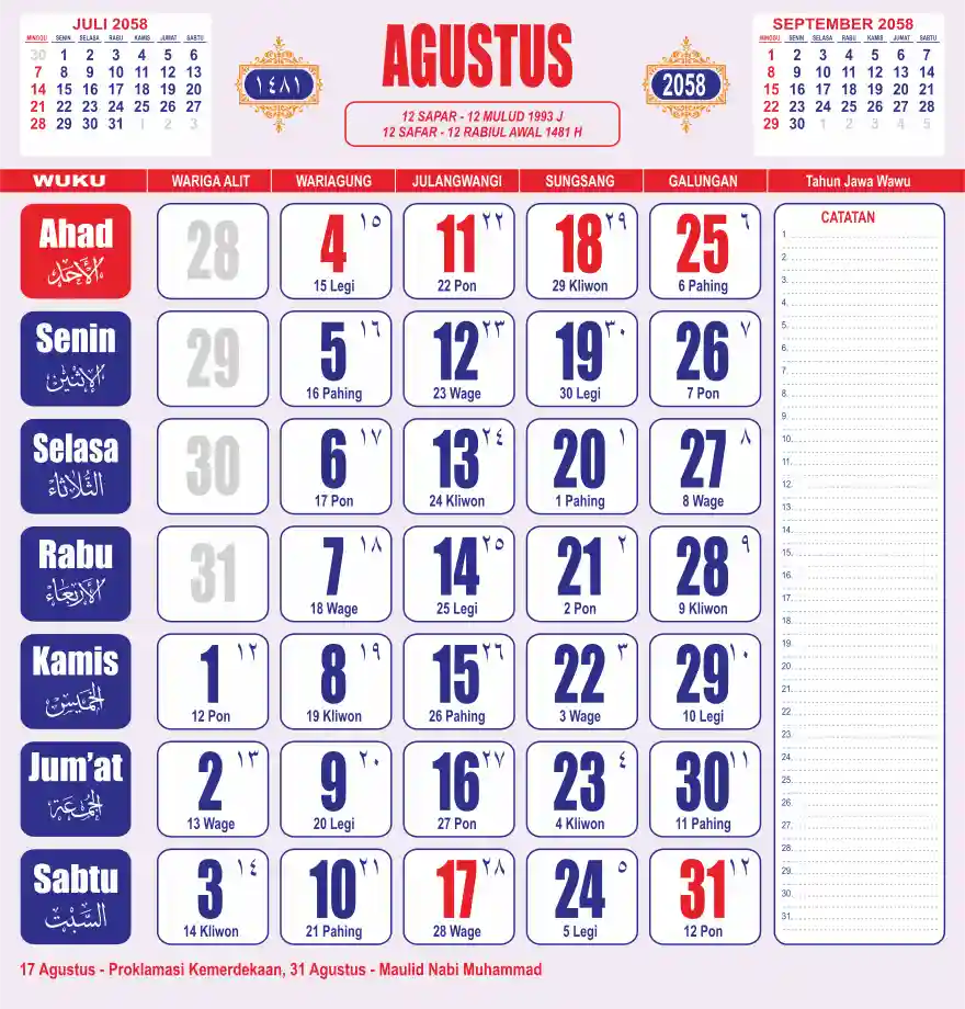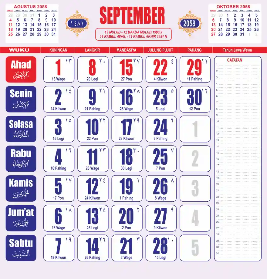 Template kalender 2058 lembaran besar jumbo yang sering dipakai oleh masyarakat jawa lengkap dengan wuku. Kalender ini biasanya di cetak 1 lembar per bulan.