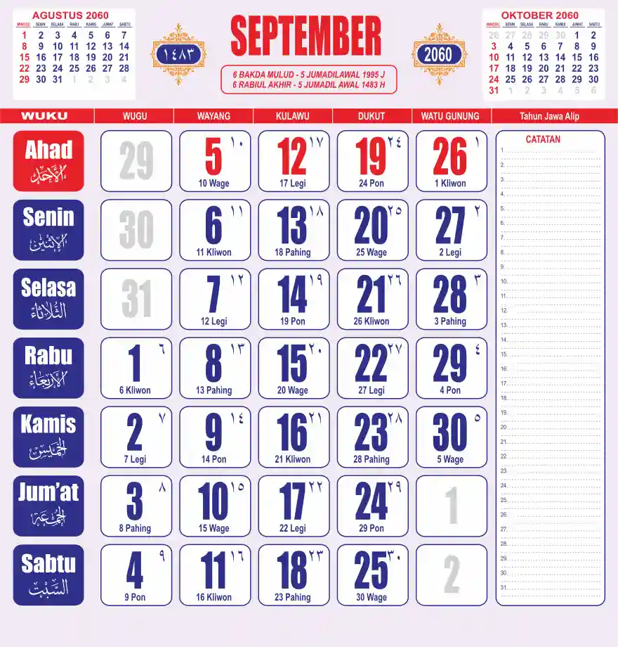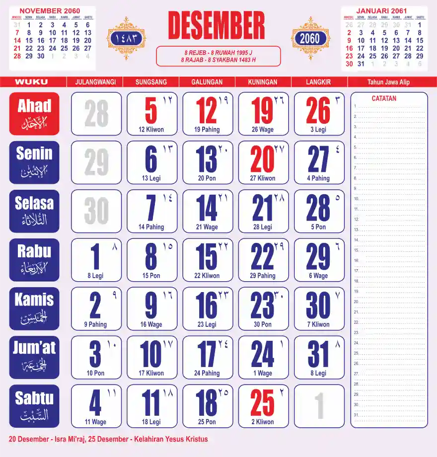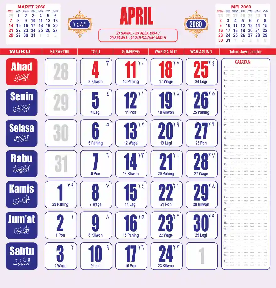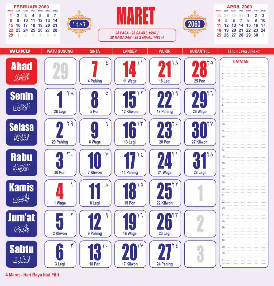 Template kalender 2060 lembaran besar jumbo yang sering dipakai oleh masyarakat jawa lengkap dengan wuku. Kalender ini biasanya di cetak 1 lembar per bulan.