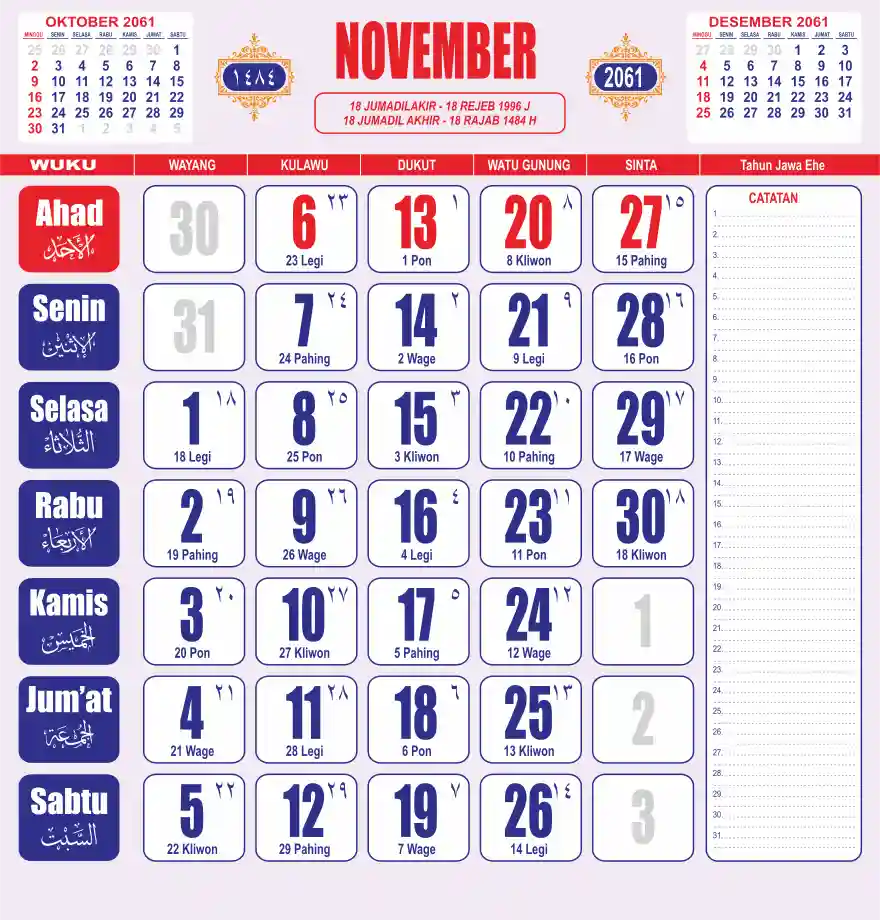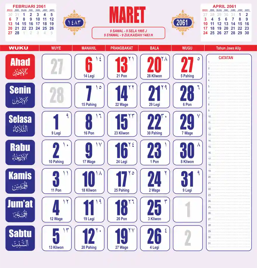 Template kalender 2061 lembaran besar jumbo yang sering dipakai oleh masyarakat jawa lengkap dengan wuku. Kalender ini biasanya di cetak 1 lembar per bulan.