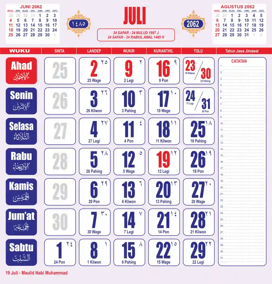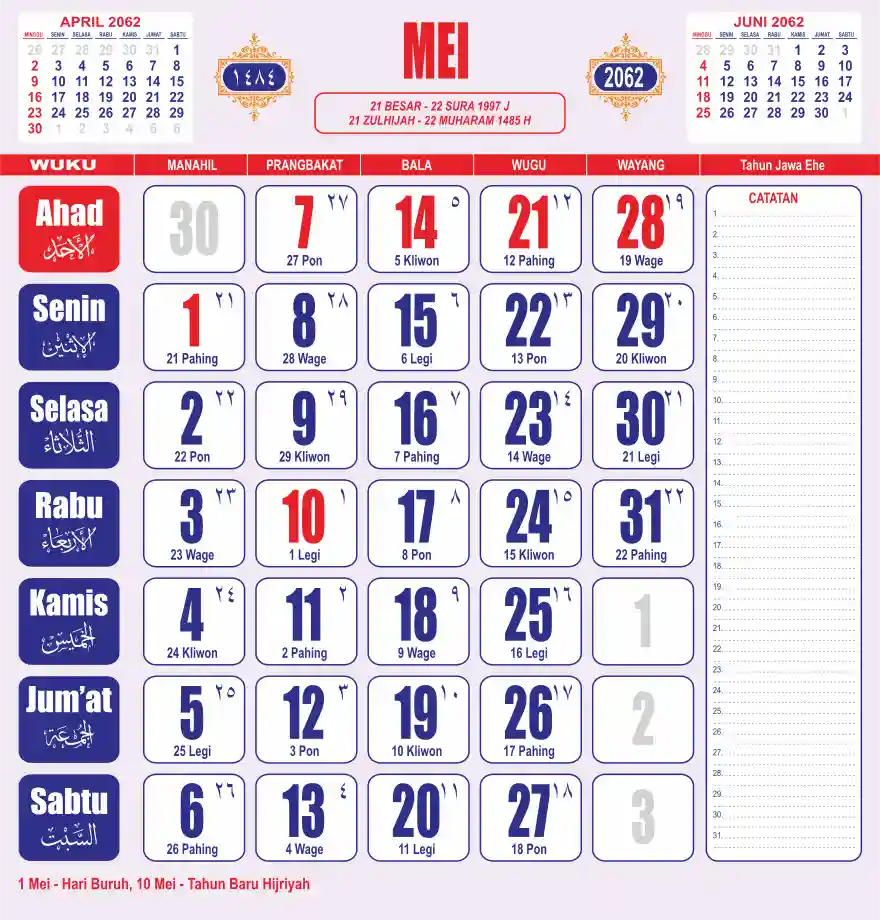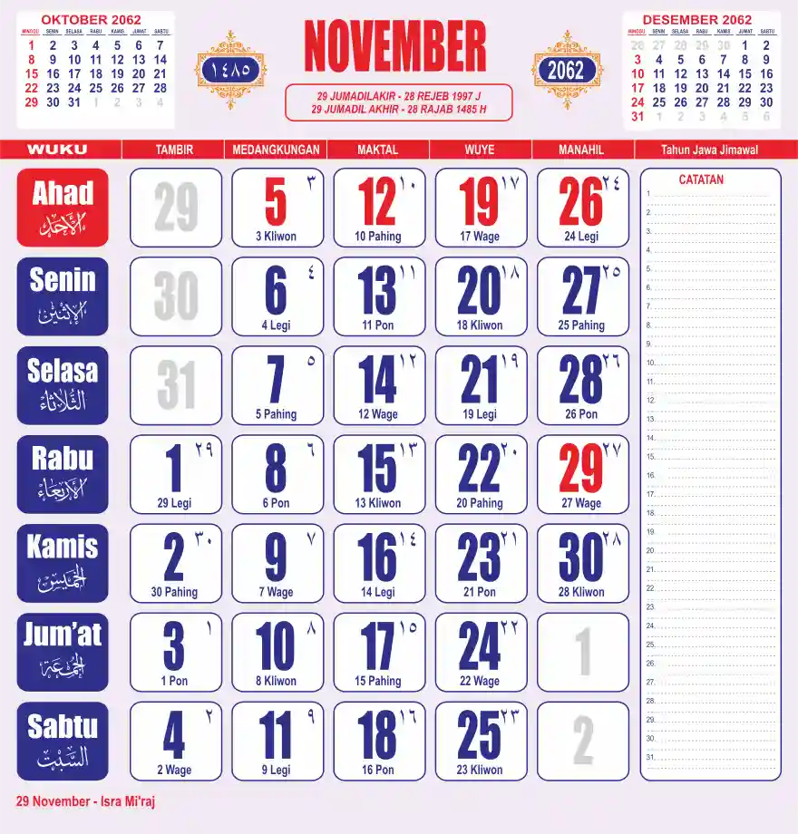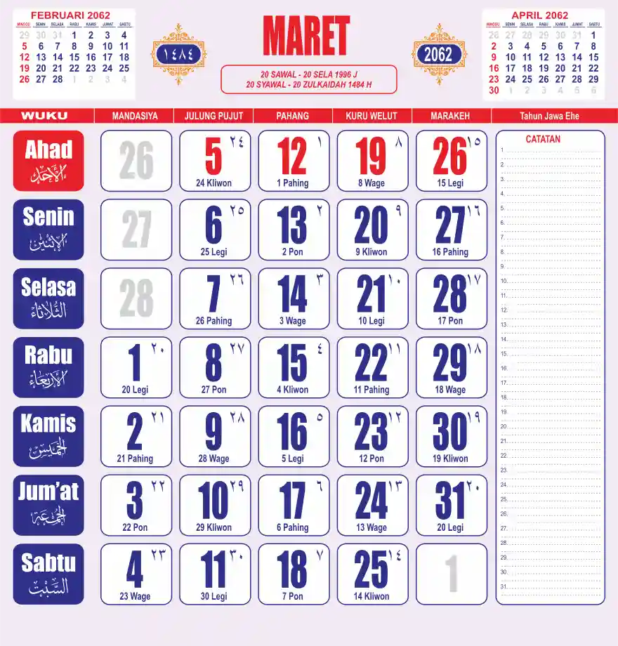 Template kalender 2062 lembaran besar jumbo yang sering dipakai oleh masyarakat jawa lengkap dengan wuku. Kalender ini biasanya di cetak 1 lembar per bulan.