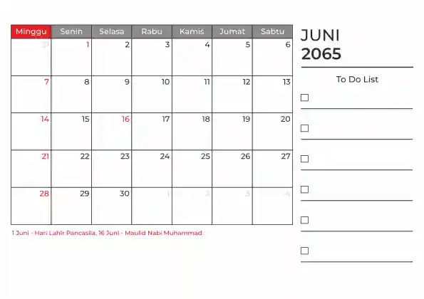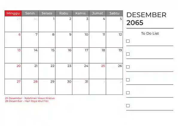 Template kalender 2065 duduk planner. Ada space kosong yang bisa di isi untuk menulis catatan dan ada space untuk menulis to do list.