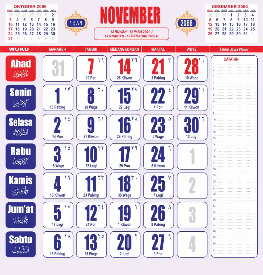 Template kalender 2066 lembaran besar jumbo yang sering dipakai oleh masyarakat jawa lengkap dengan wuku. Kalender ini biasanya di cetak 1 lembar per bulan.