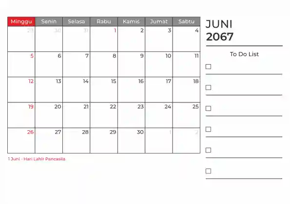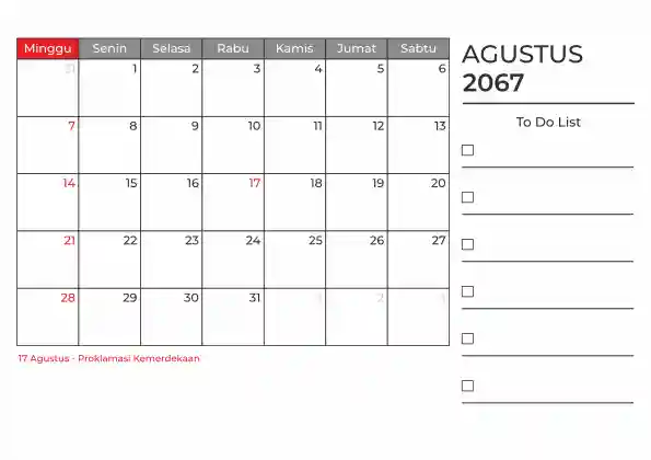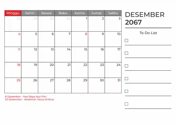 Template kalender 2067 duduk planner. Ada space kosong yang bisa di isi untuk menulis catatan dan ada space untuk menulis to do list.