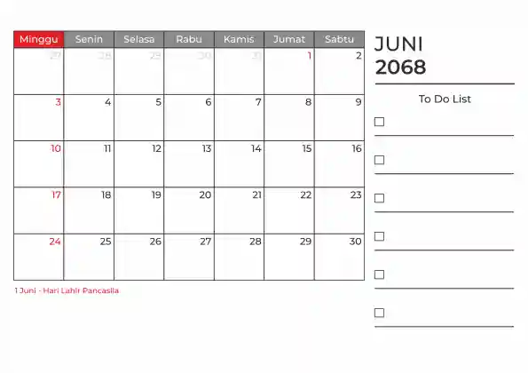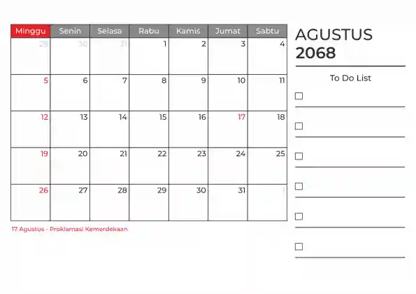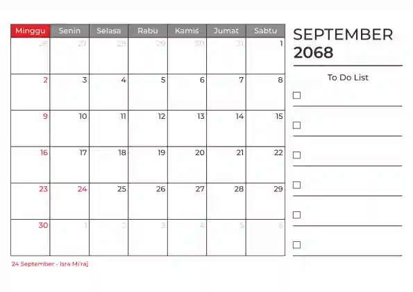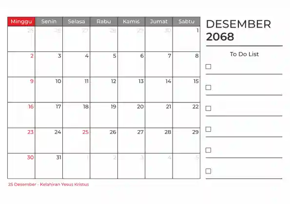 Template kalender 2068 duduk planner. Ada space kosong yang bisa di isi untuk menulis catatan dan ada space untuk menulis to do list.