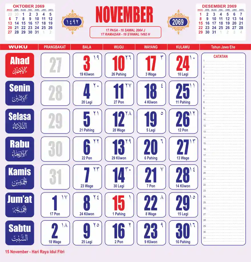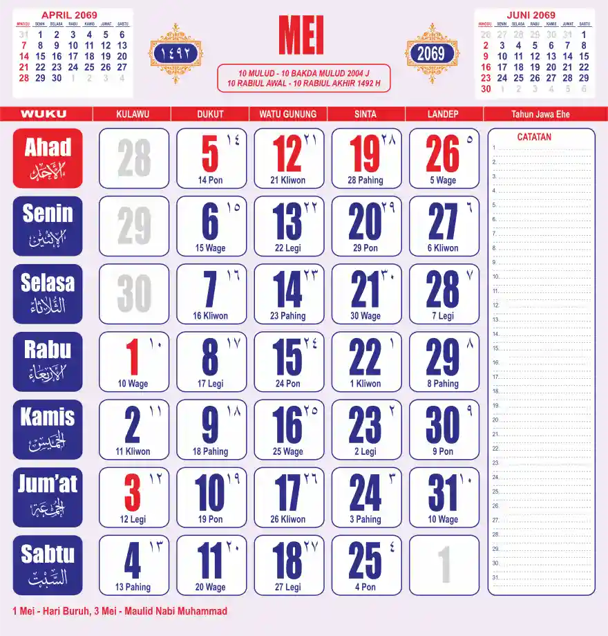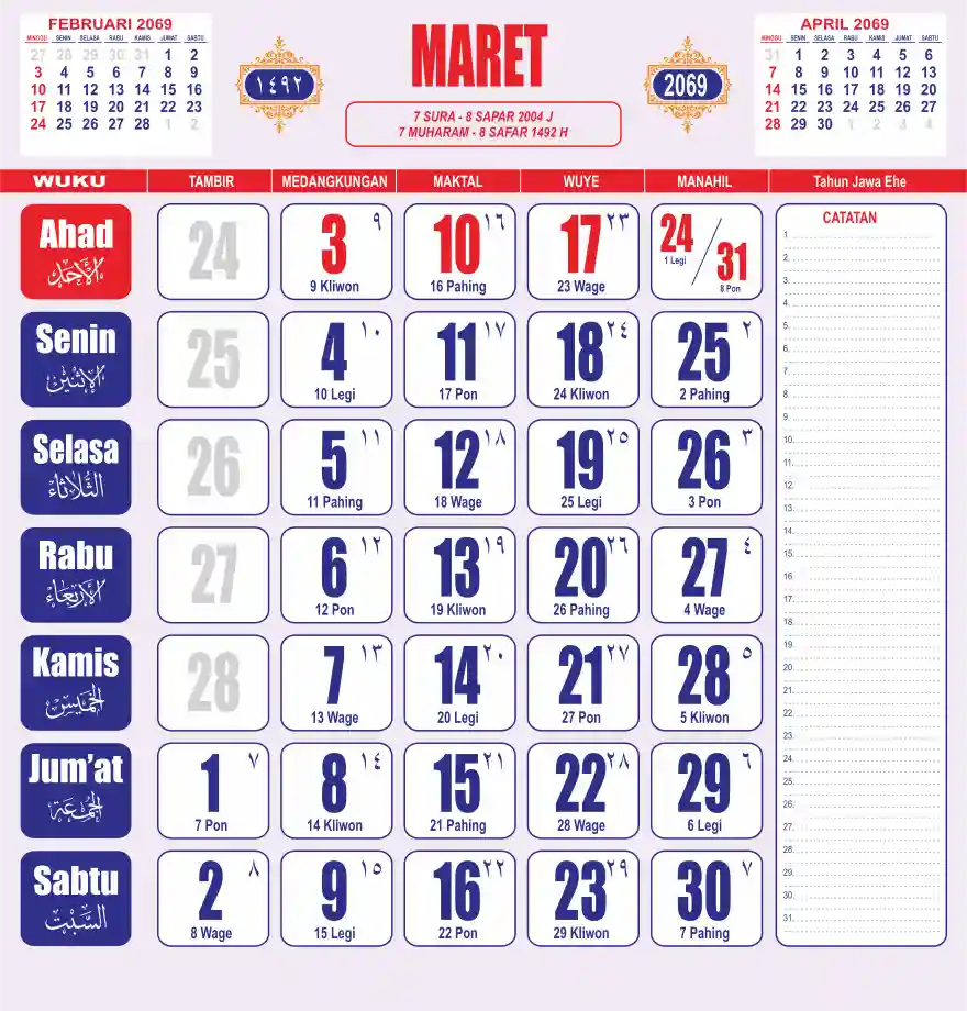 Template kalender 2069 lembaran besar jumbo yang sering dipakai oleh masyarakat jawa lengkap dengan wuku. Kalender ini biasanya di cetak 1 lembar per bulan.