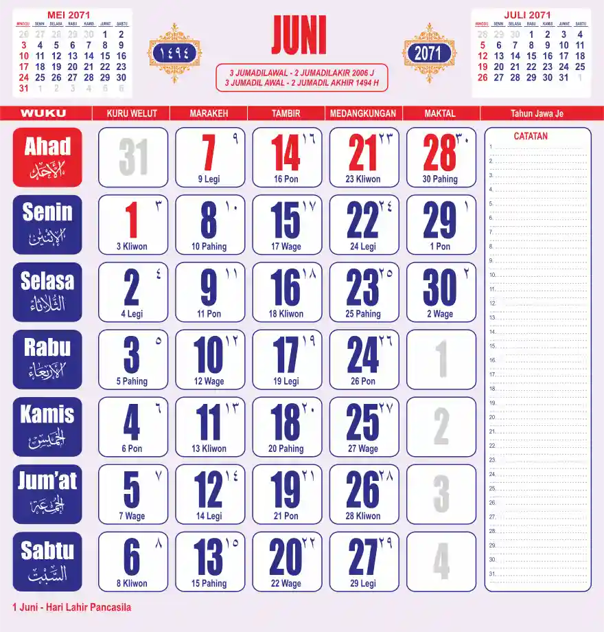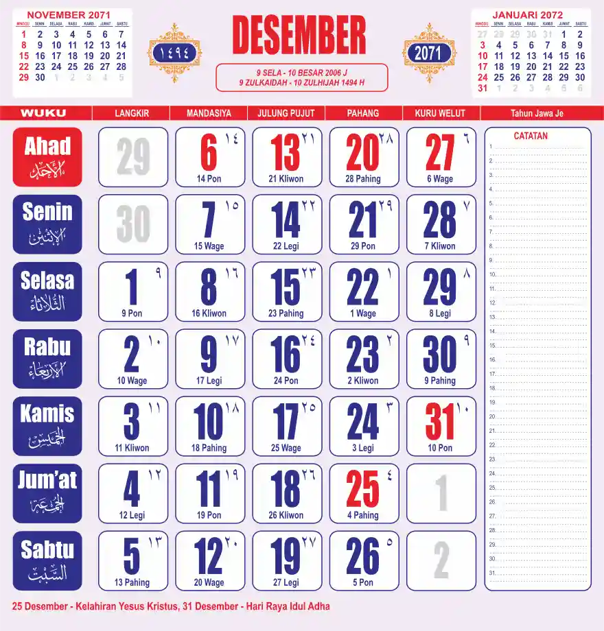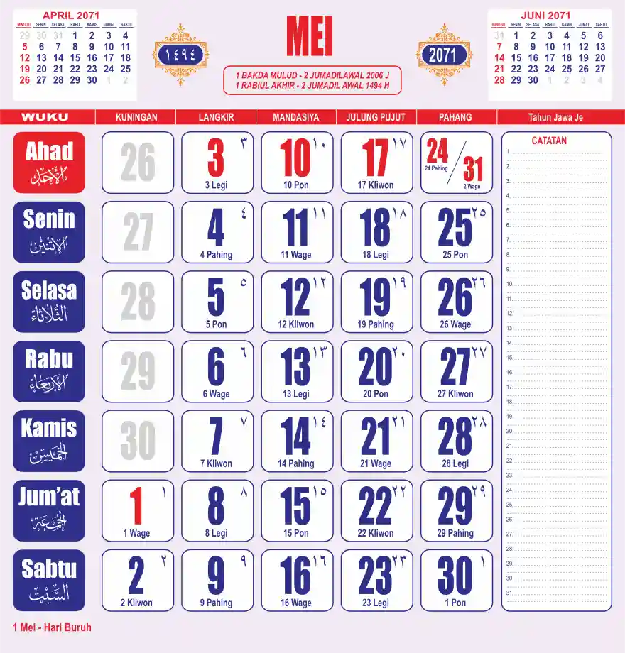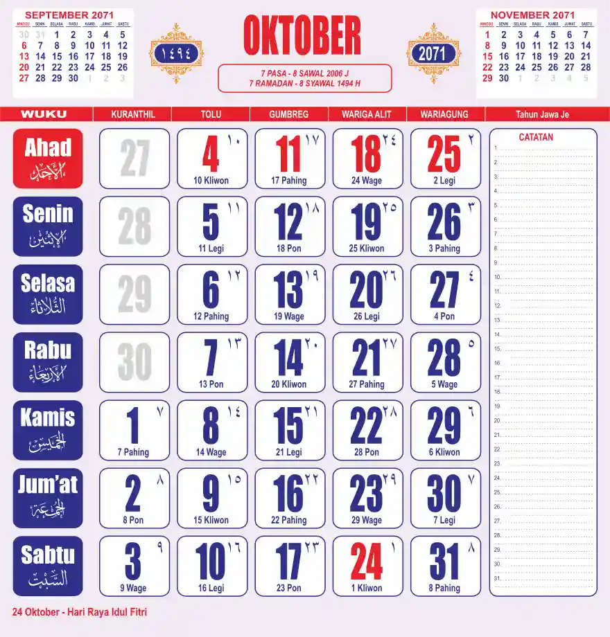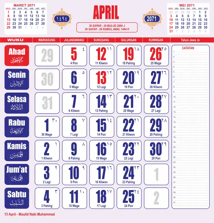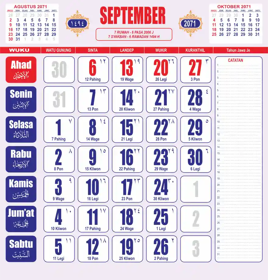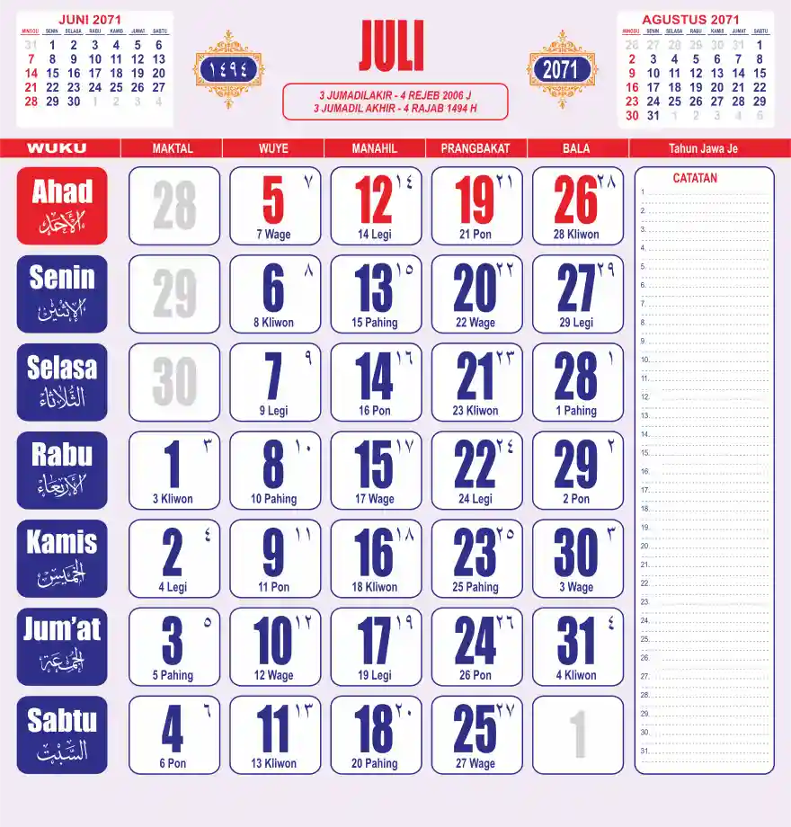 Template kalender 2071 lembaran besar jumbo yang sering dipakai oleh masyarakat jawa lengkap dengan wuku. Kalender ini biasanya di cetak 1 lembar per bulan.