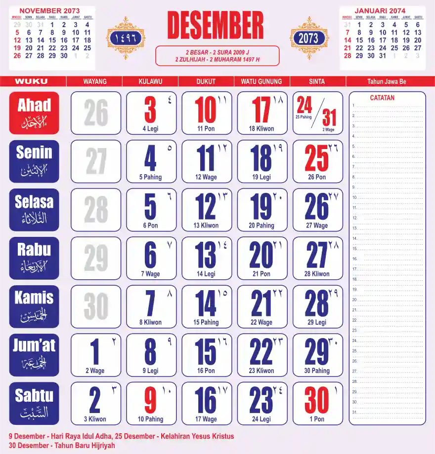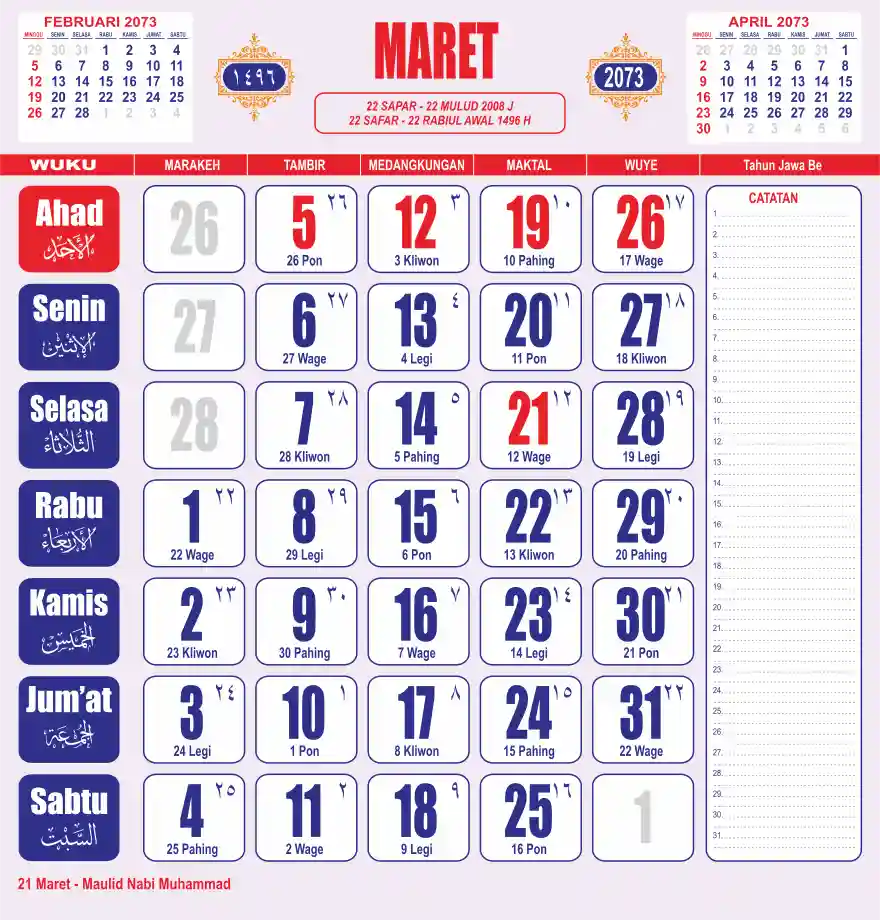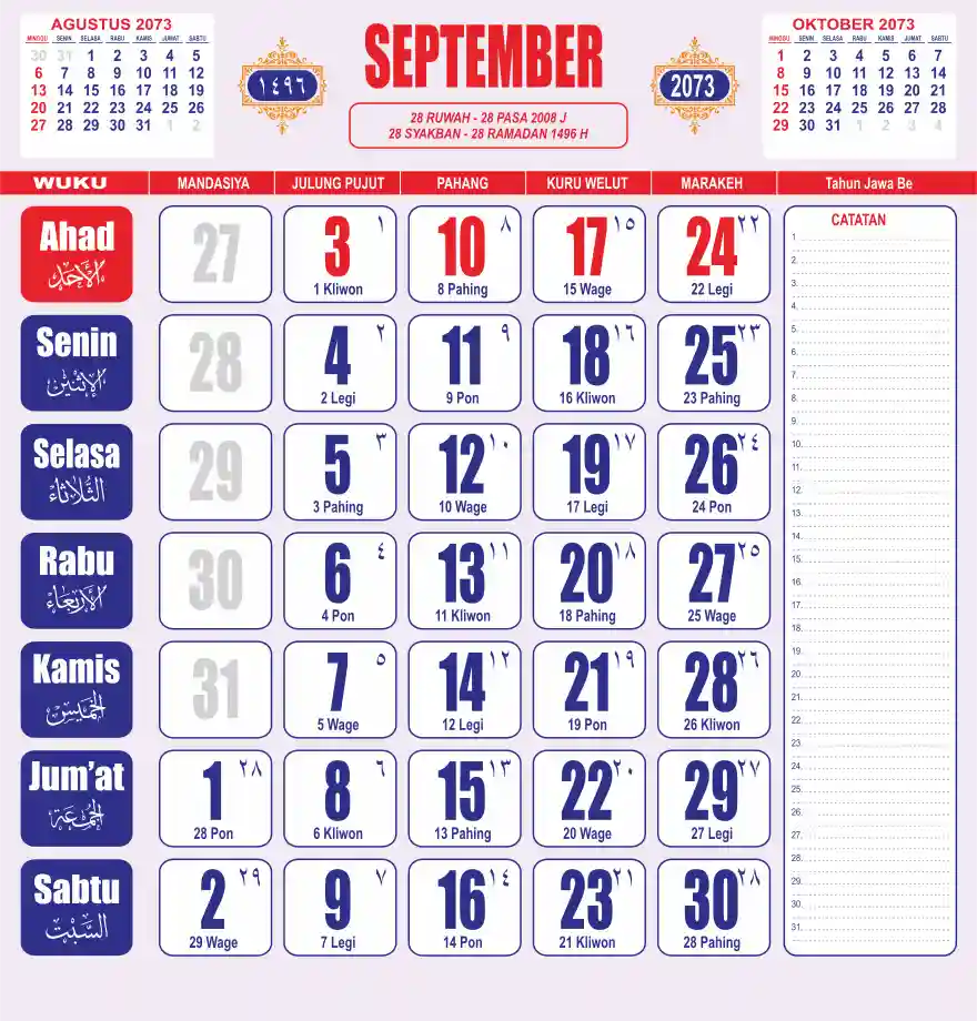 Template kalender 2073 lembaran besar jumbo yang sering dipakai oleh masyarakat jawa lengkap dengan wuku. Kalender ini biasanya di cetak 1 lembar per bulan.