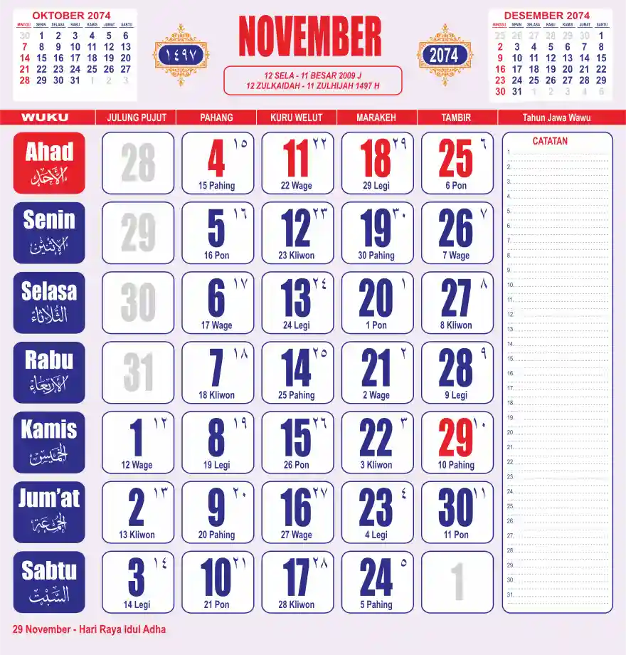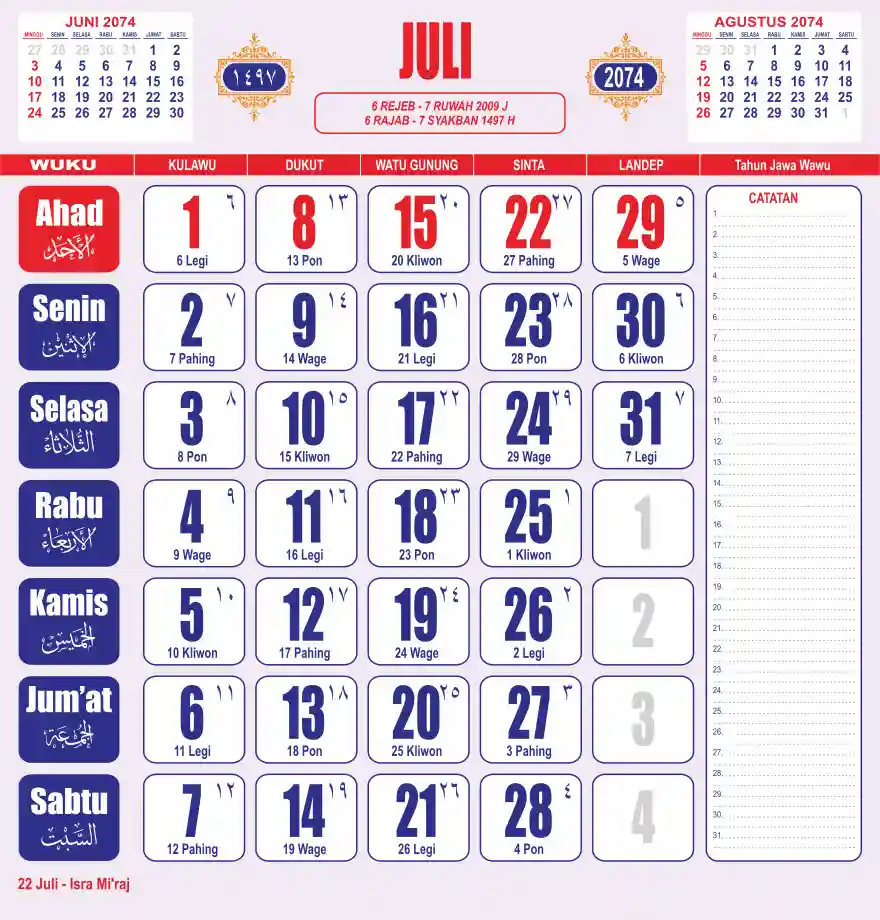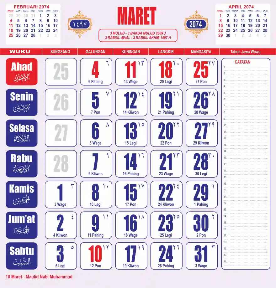 Template kalender 2074 lembaran besar jumbo yang sering dipakai oleh masyarakat jawa lengkap dengan wuku. Kalender ini biasanya di cetak 1 lembar per bulan.