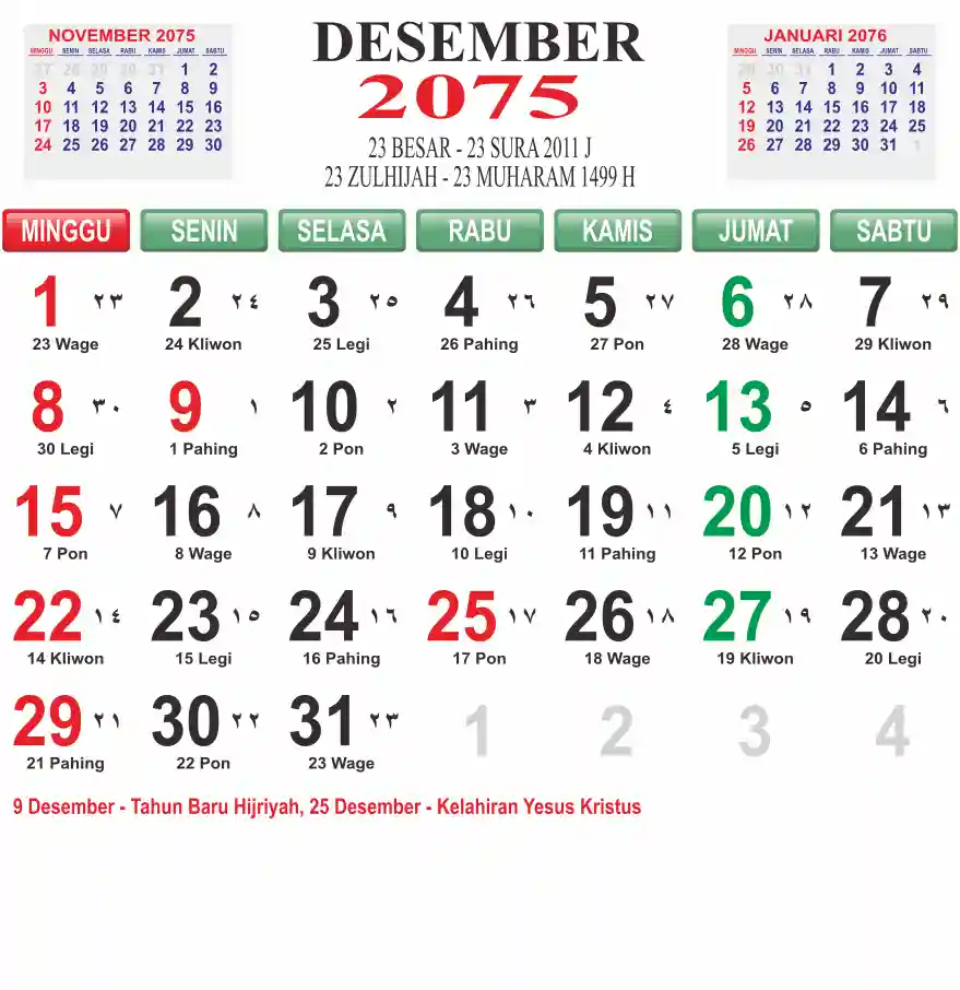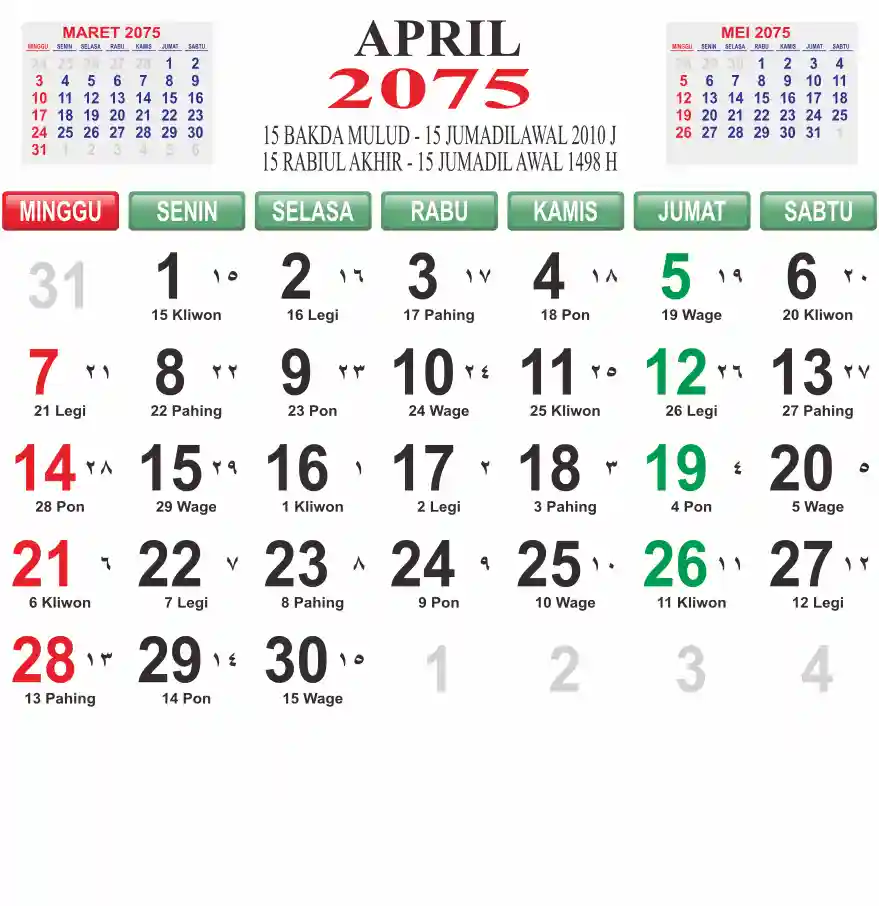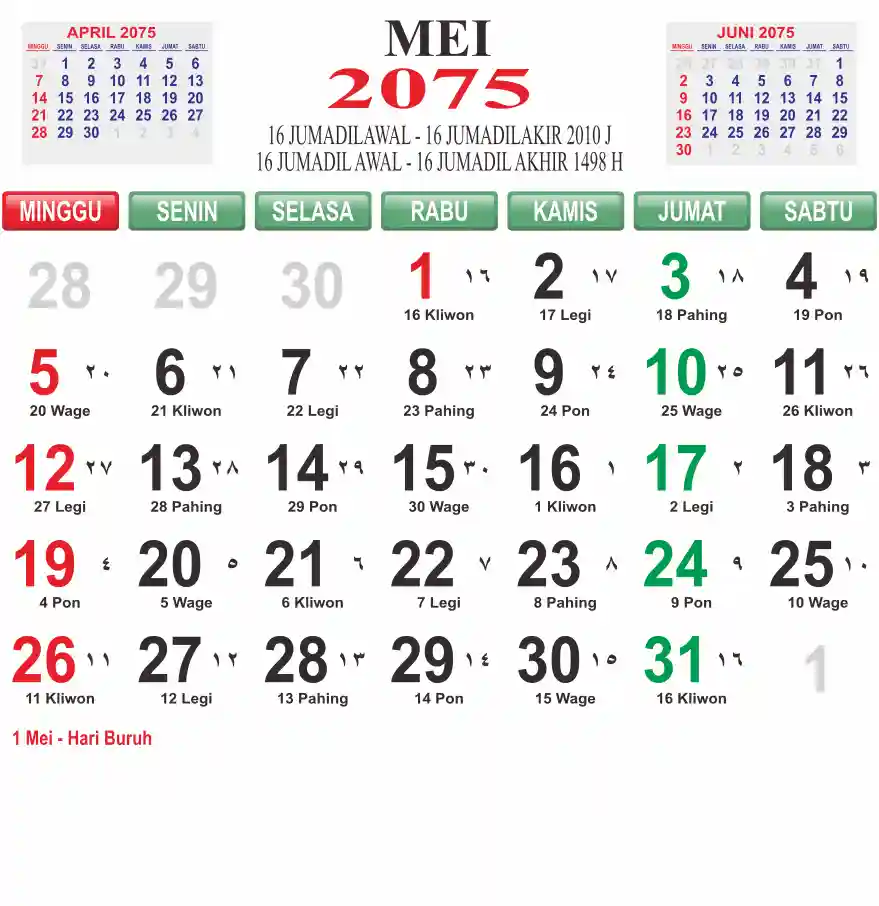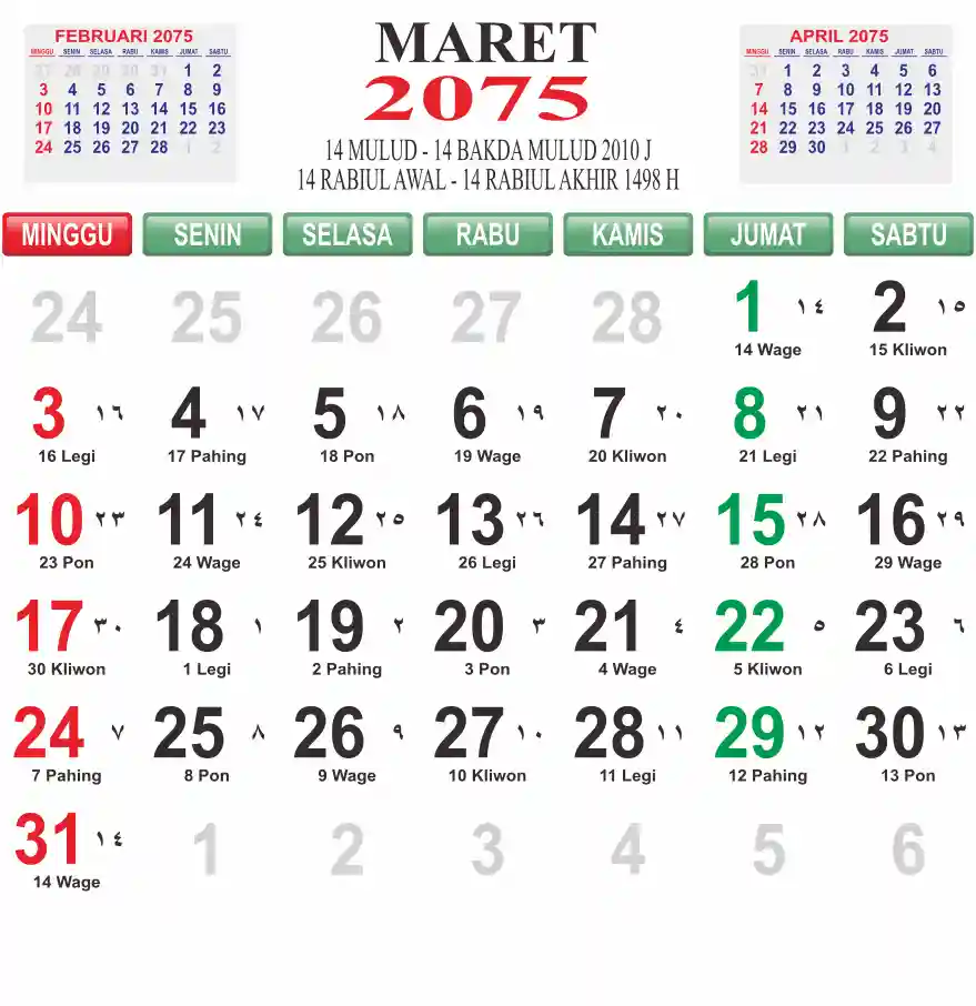 Template kalender 2075 lembaran besar jumbo yang mudah di baca dari jarak jauh. Kalender ini biasanya di cetak 1 lembar per bulan.